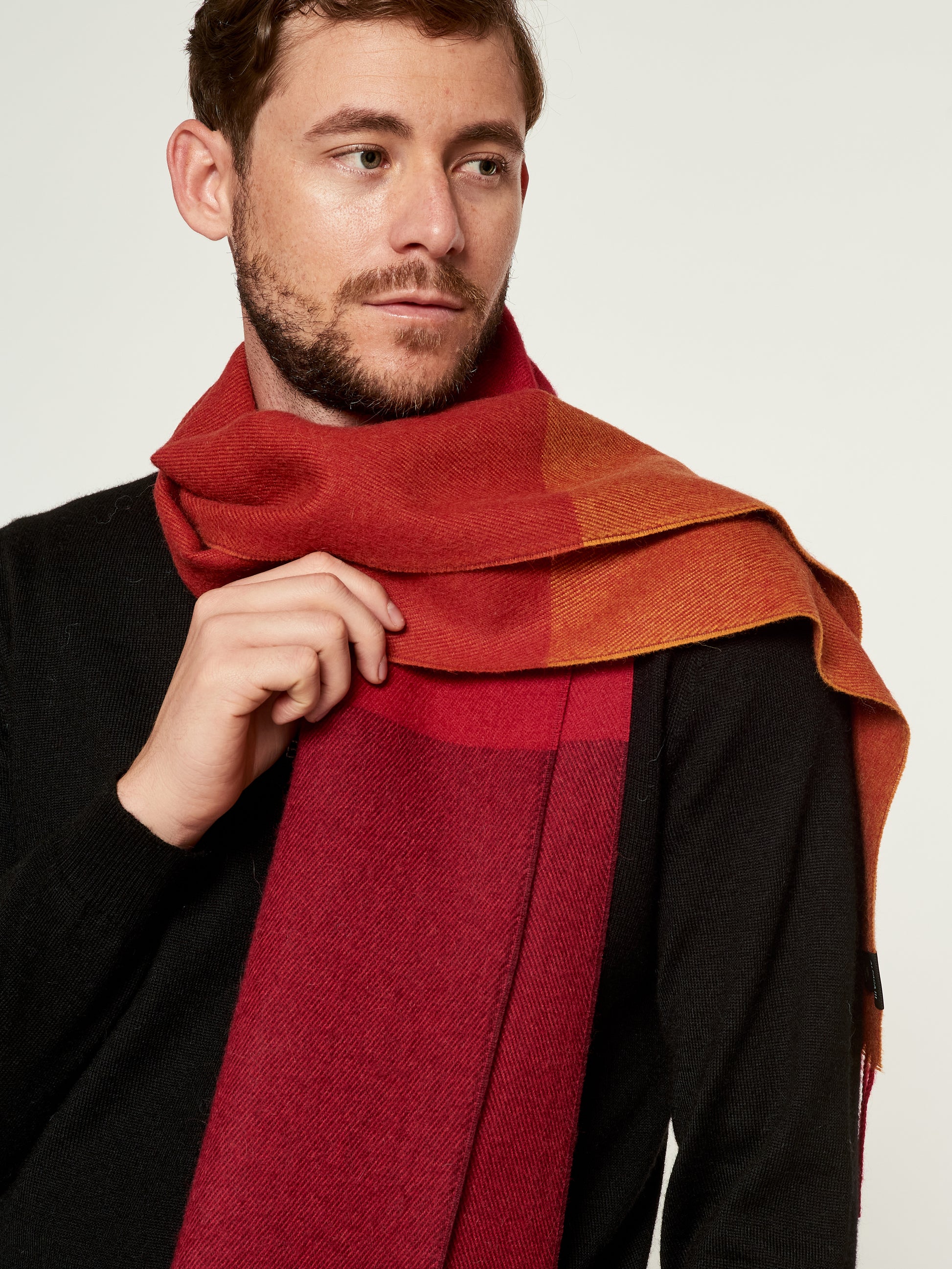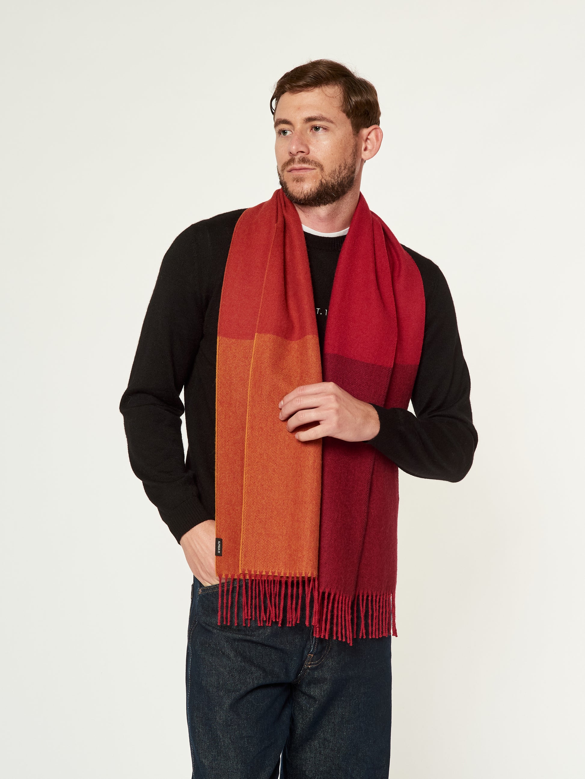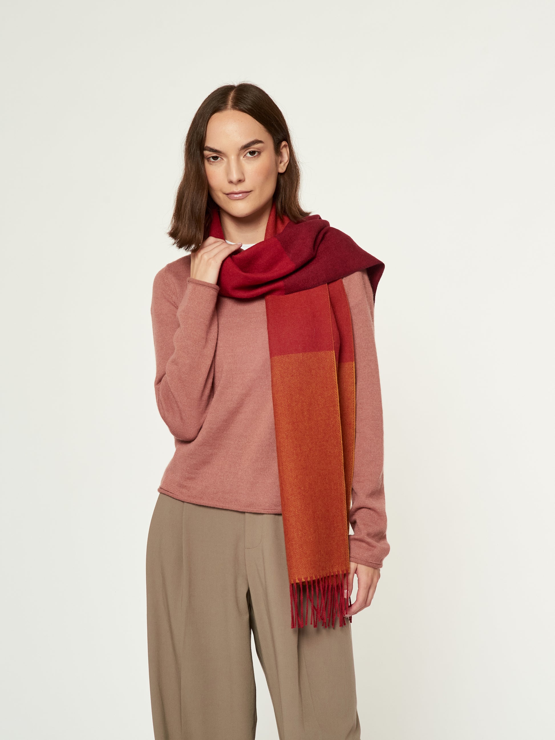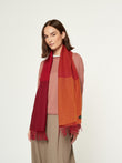 Chalina Lulusar en tonalidad rojo, confeccionada en baby alpaca. Este accesorio unisex destaca por su moderno diseño de cuadros estilo color block en una sofisticada degradación de tonos que van desde el terracota hasta el granate intenso. Presenta bordes terminados en flecos clásicos, combinando una calidez excepcional con una estética geométrica y contemporánea. | Material predominante: Baby Alpaca