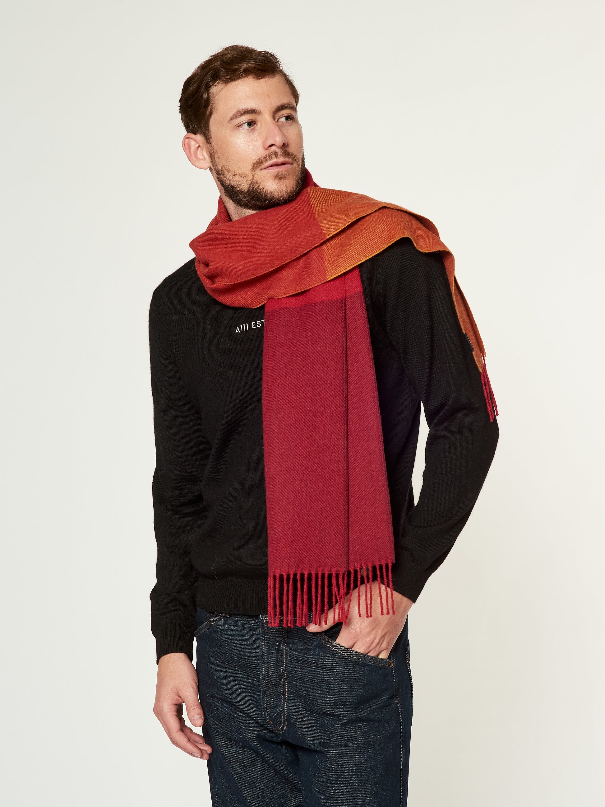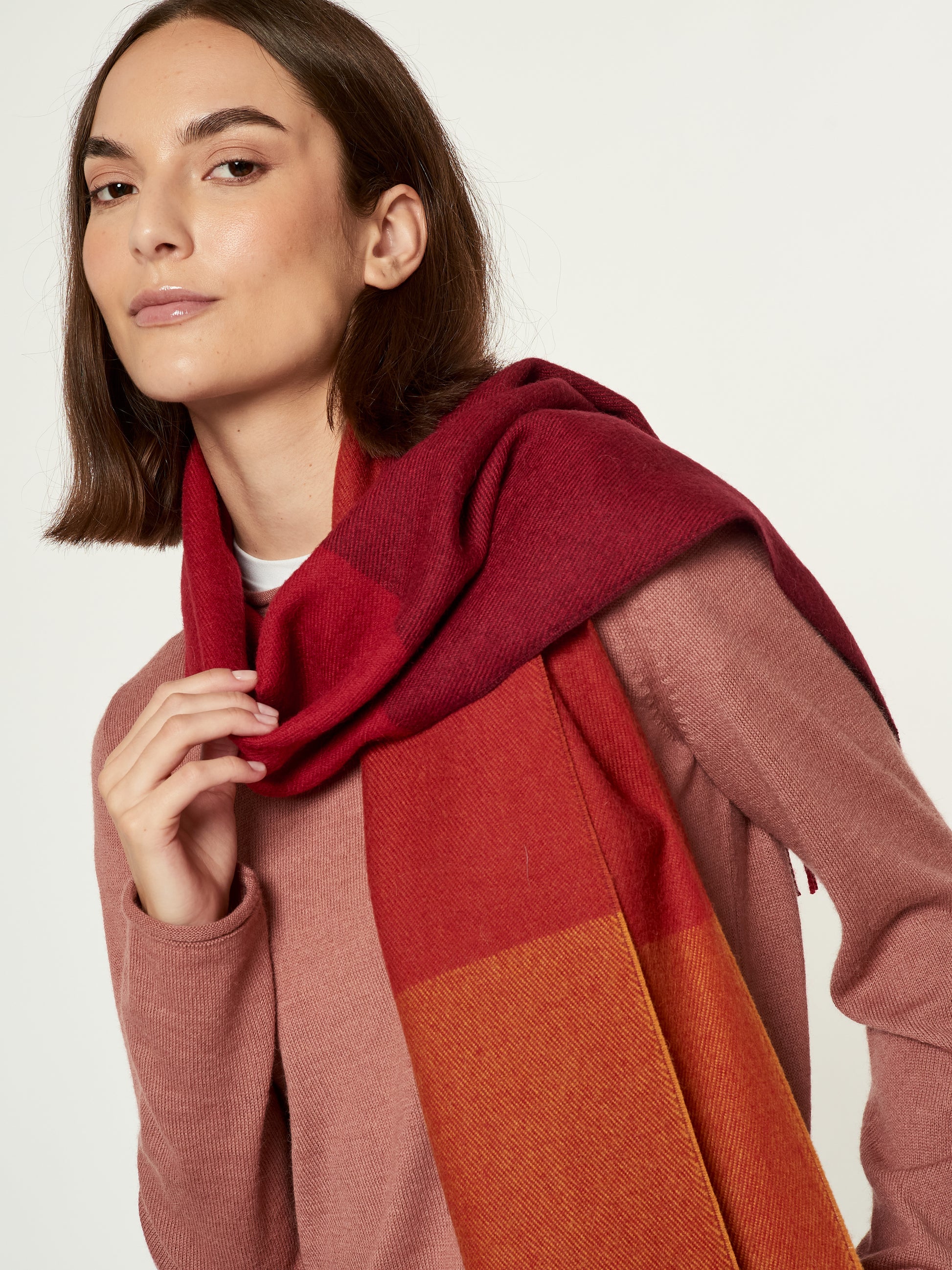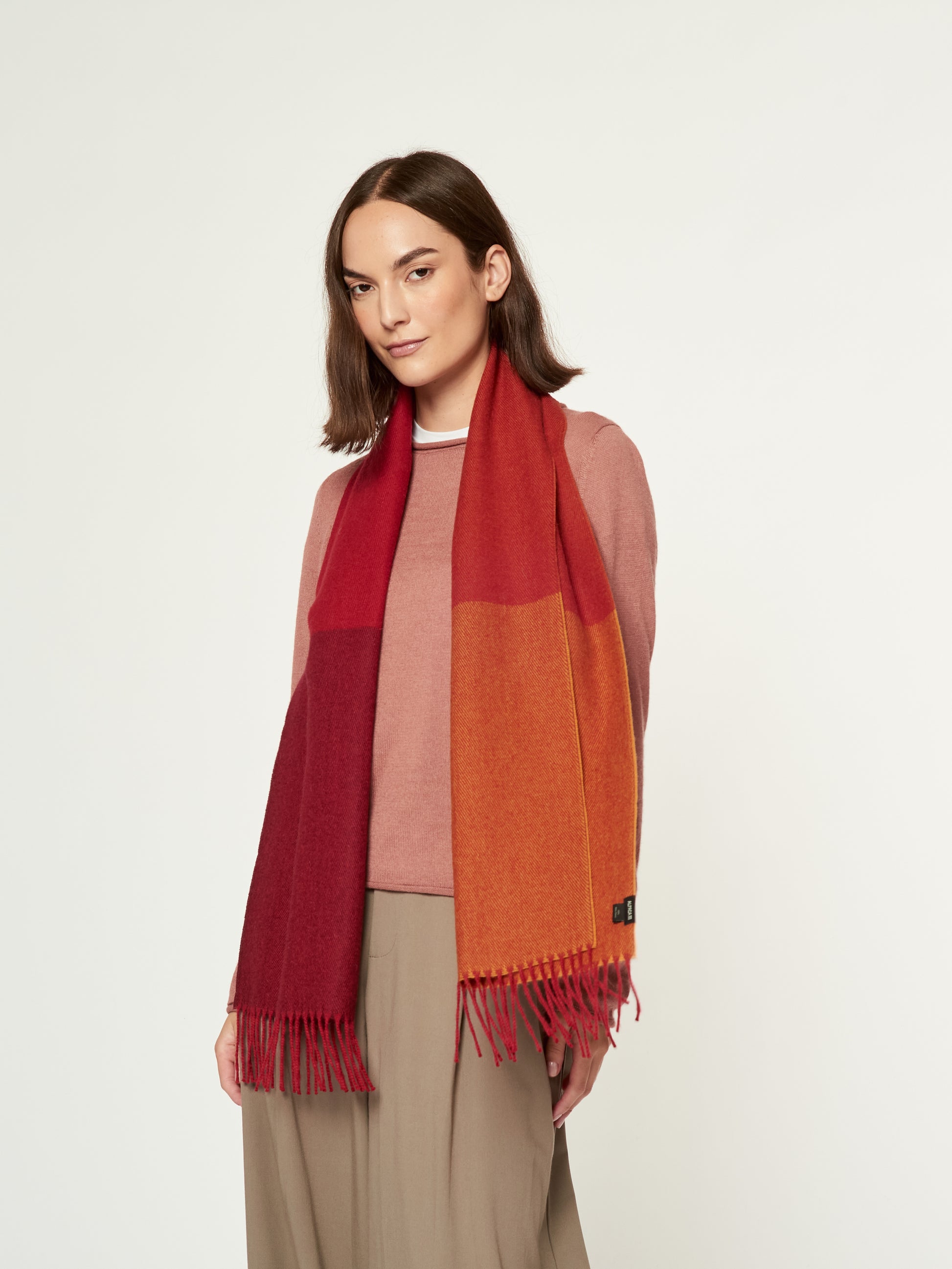 Chalina Lulusar en tonalidad rojo, confeccionada en baby alpaca. Este accesorio unisex destaca por su moderno diseño de cuadros estilo color block en una sofisticada degradación de tonos que van desde el terracota hasta el granate intenso. Presenta bordes terminados en flecos clásicos, combinando una calidez excepcional con una estética geométrica y contemporánea. | Material predominante: Baby Alpaca