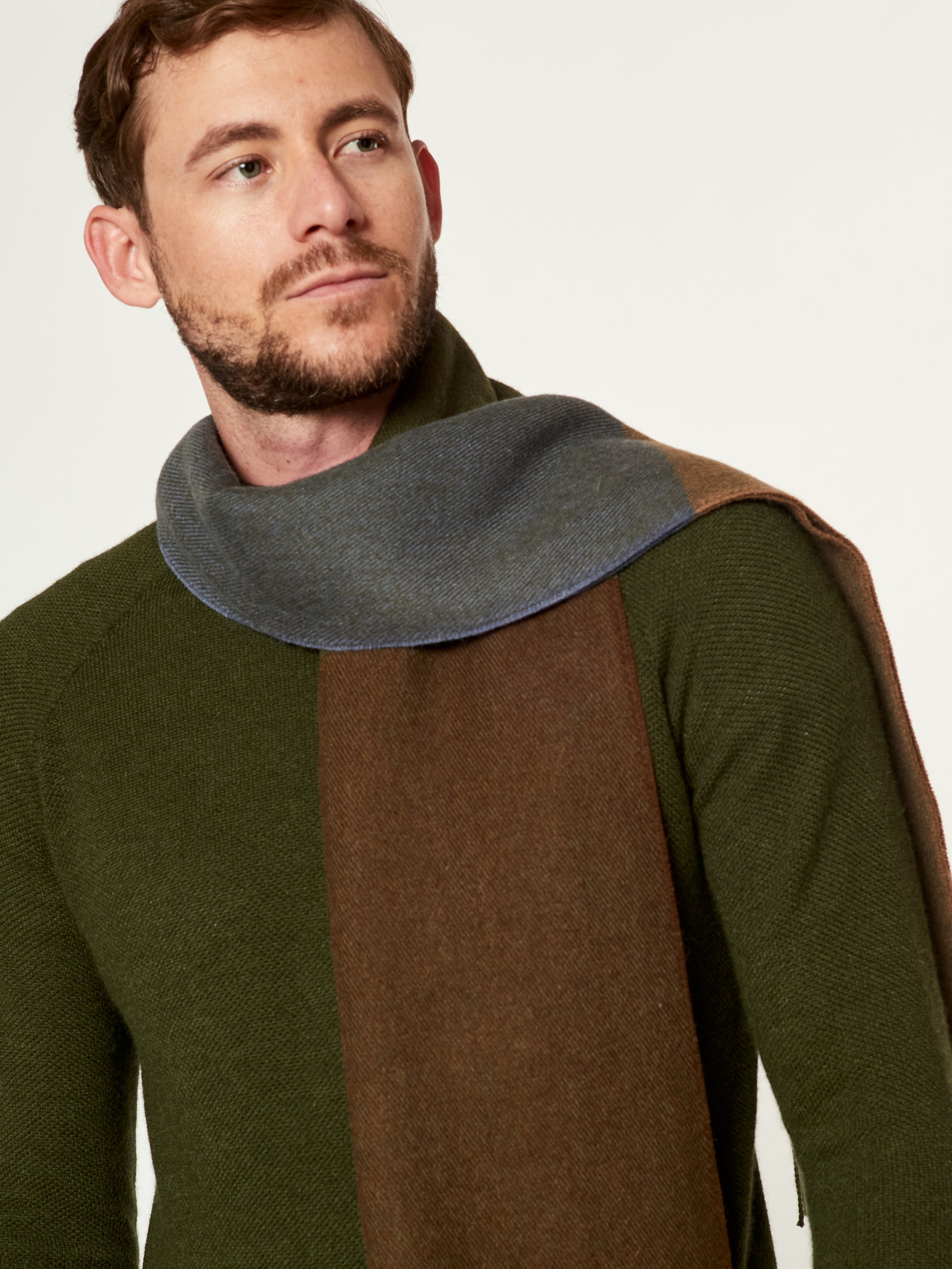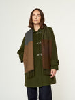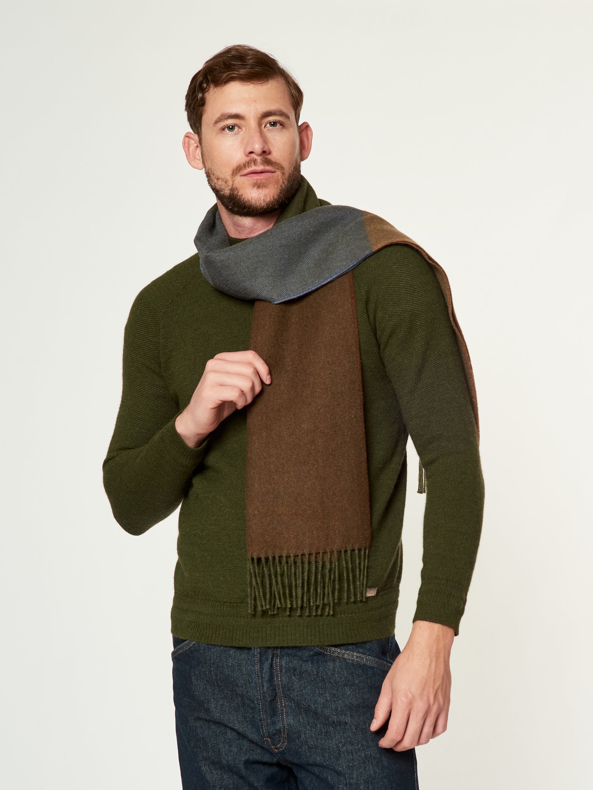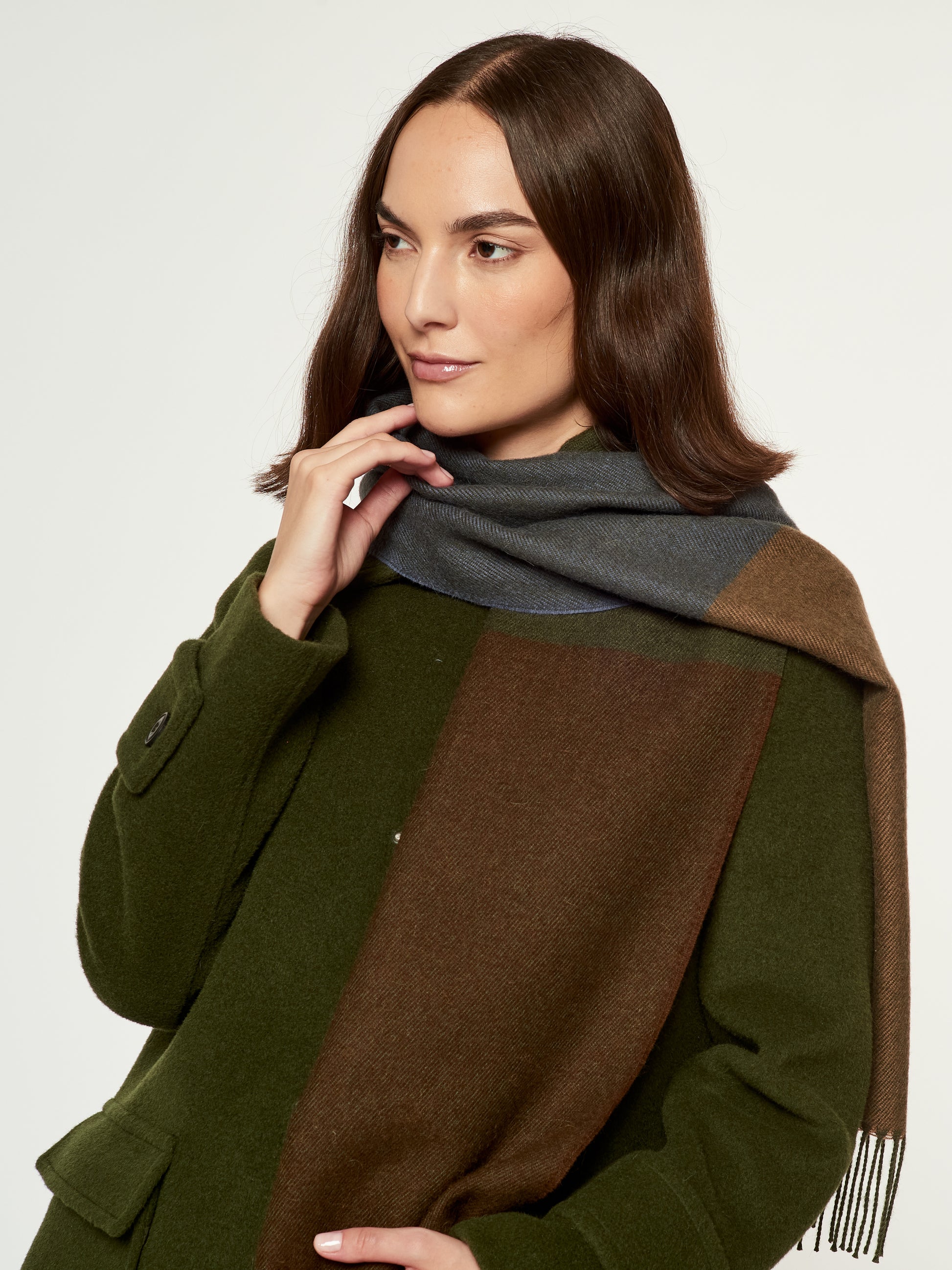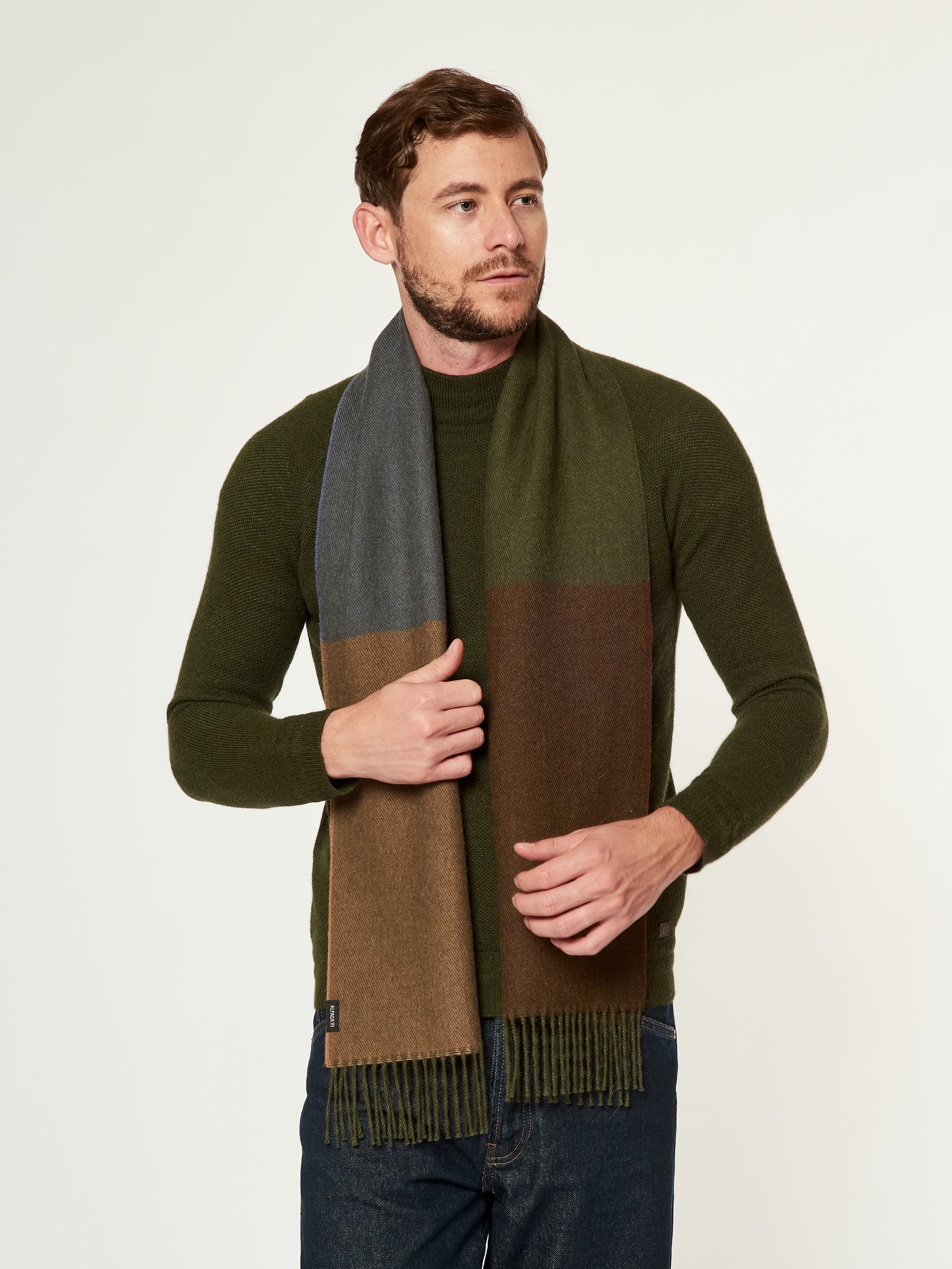 Chalina Lulusar en tonalidad verde, confeccionada en baby alpaca. Este accesorio unisex destaca por su moderno diseño de cuadros estilo color block en una sofisticada degradación de tonos que van desde el oliva hasta el verde musgo y carbón. Presenta bordes terminados en flecos clásicos, combinando una calidez excepcional con una estética geométrica y contemporánea. | Material predominante: Baby Alpaca