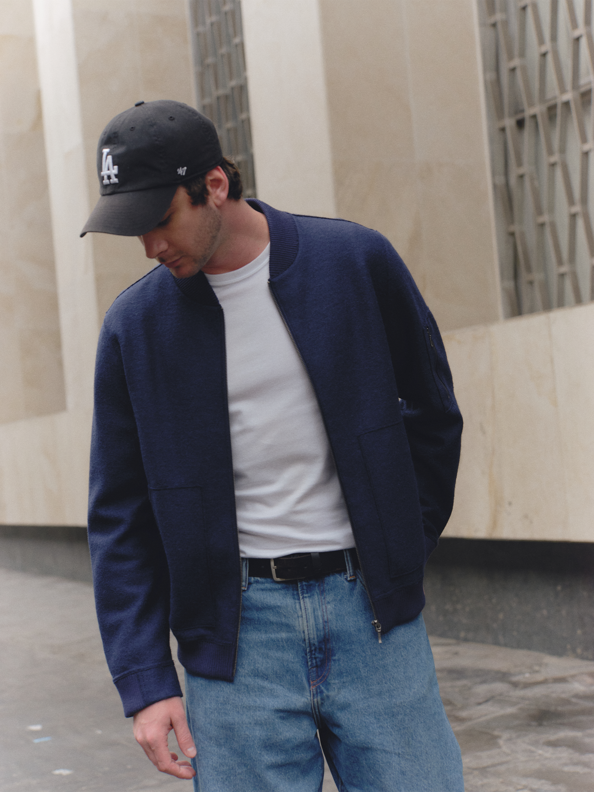 Casaca Brocken en tonalidad azul oscuro, confeccionada en una mezcla de lana y alpaca. De estilo bomber, presenta un cierre metálico frontal y bolsillos tipo parche, combinando diseño clásico con un acabado contemporáneo. | Material predominante: Lana