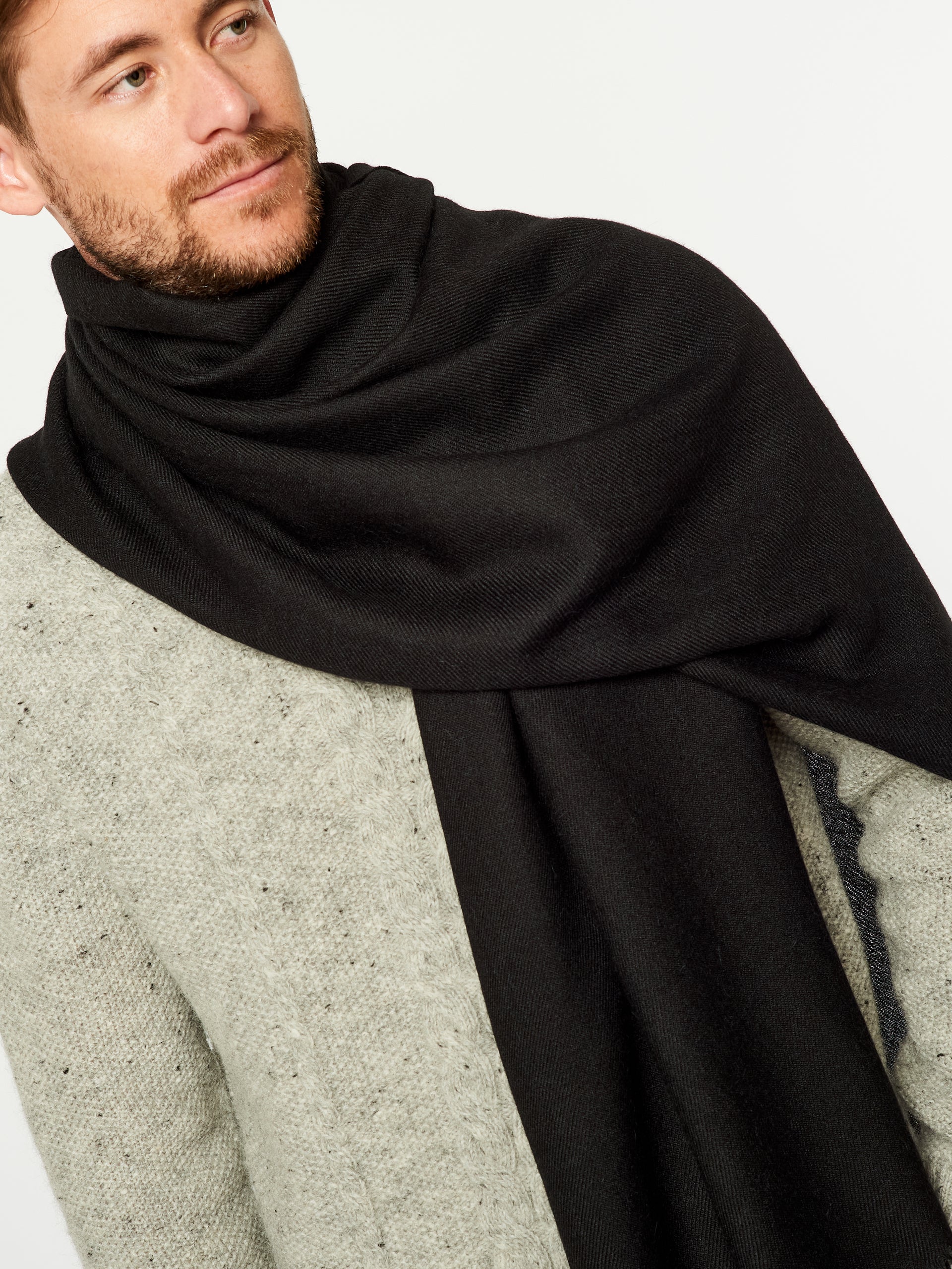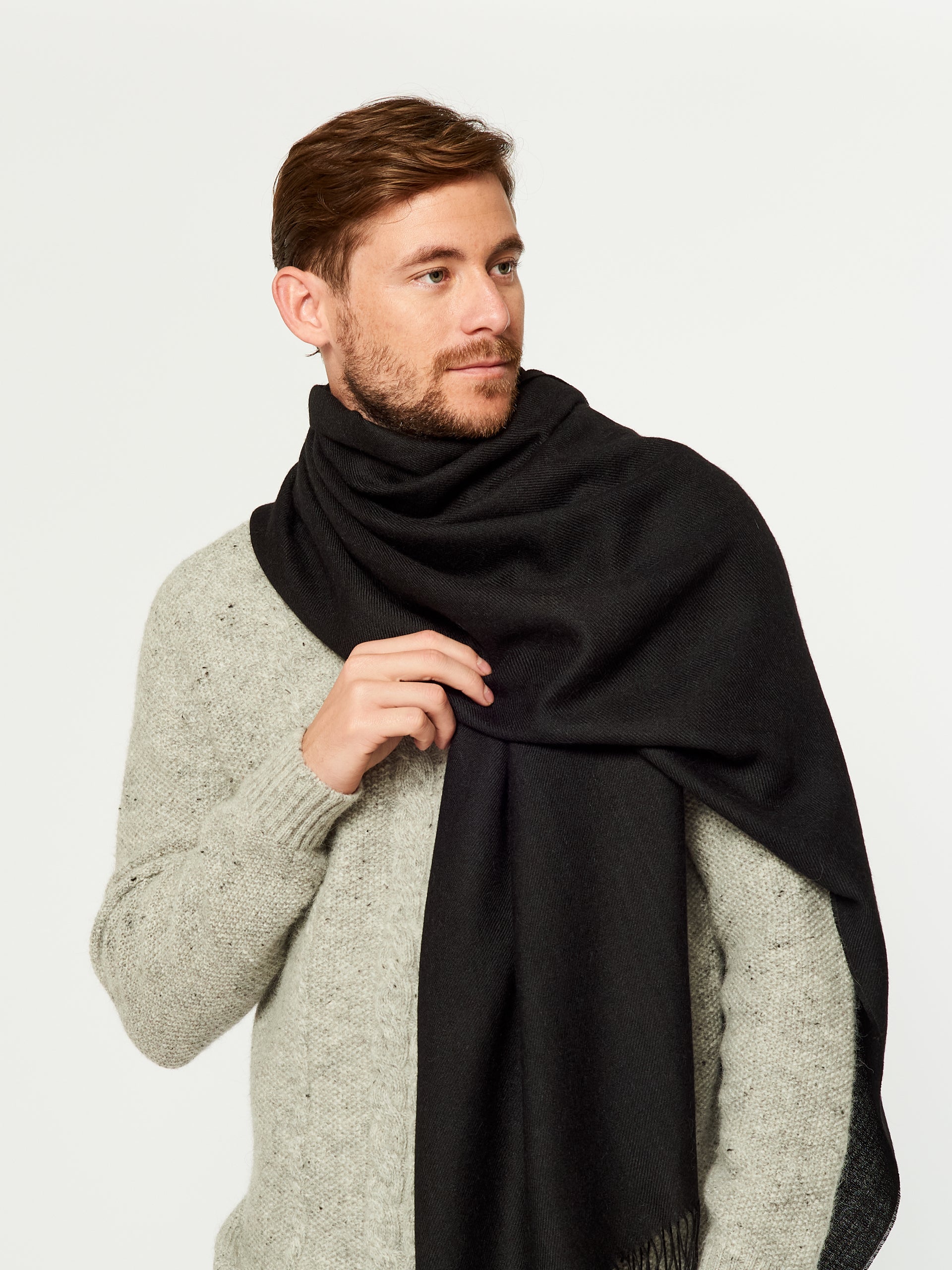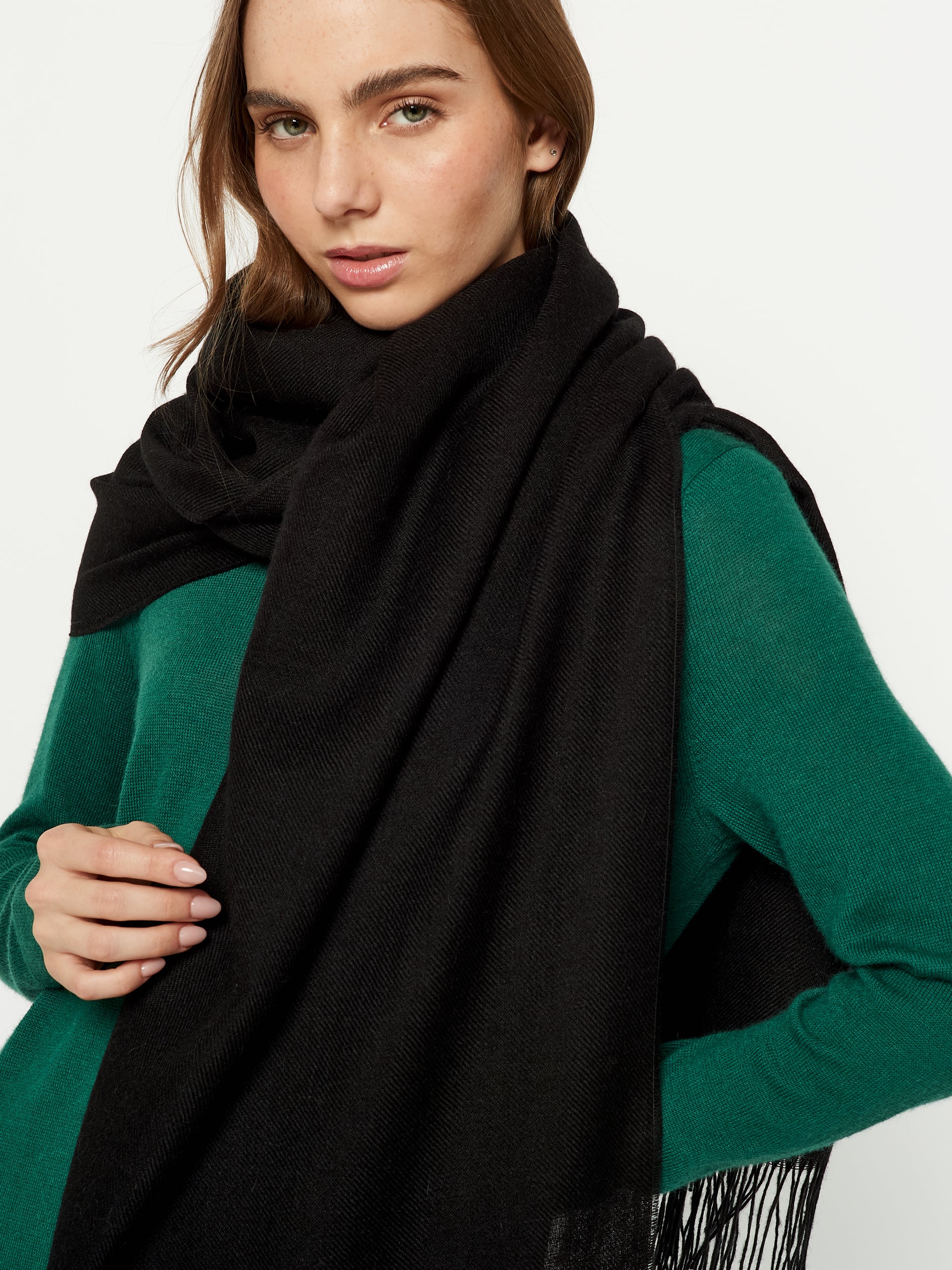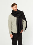 Estola Kamet en tonalidad negro, destaca por su diseño de color entero que resalta su simplicidad elegante. Tejida en 100% baby alpaca. | Material predominante: Baby Alpaca