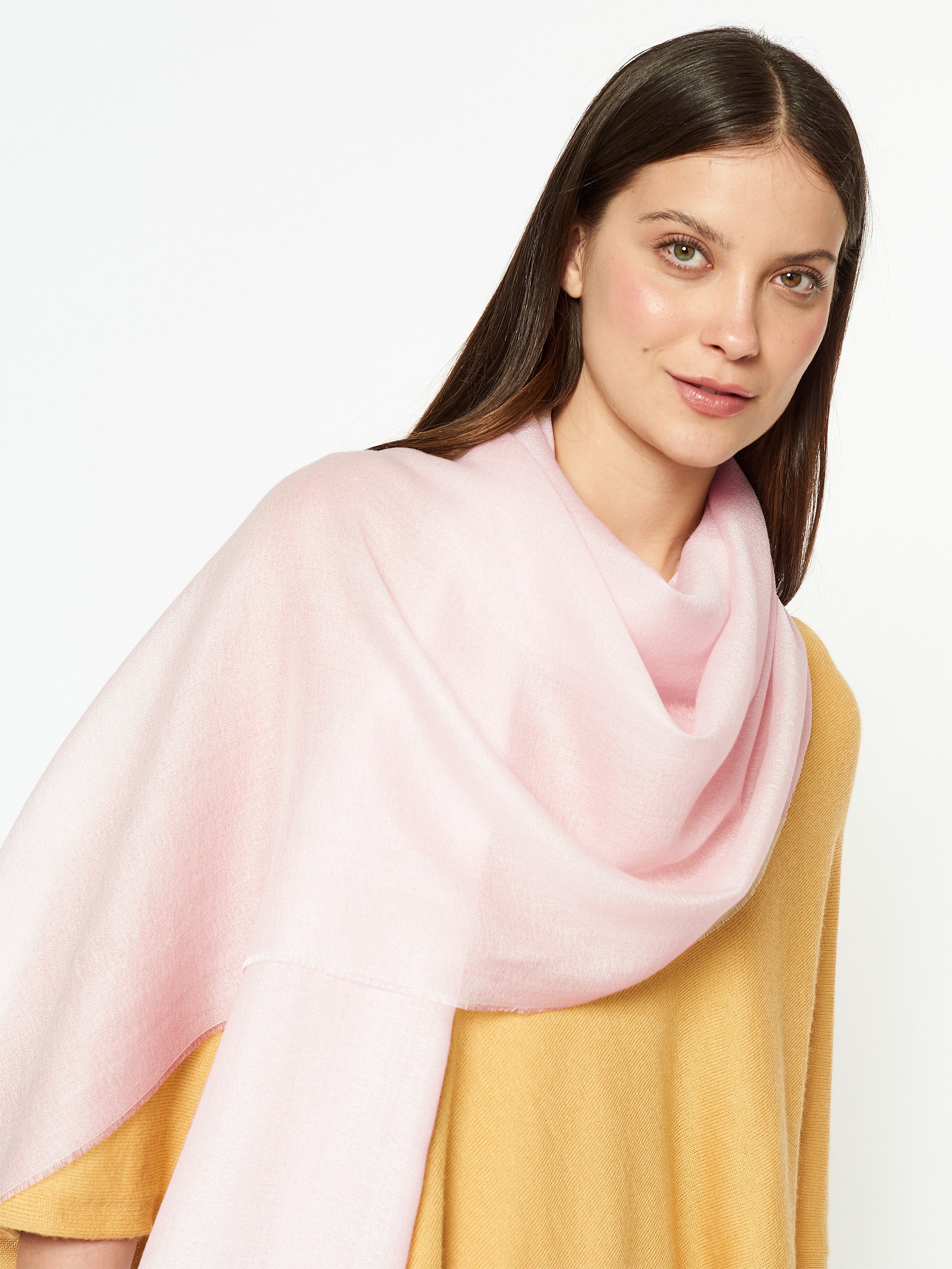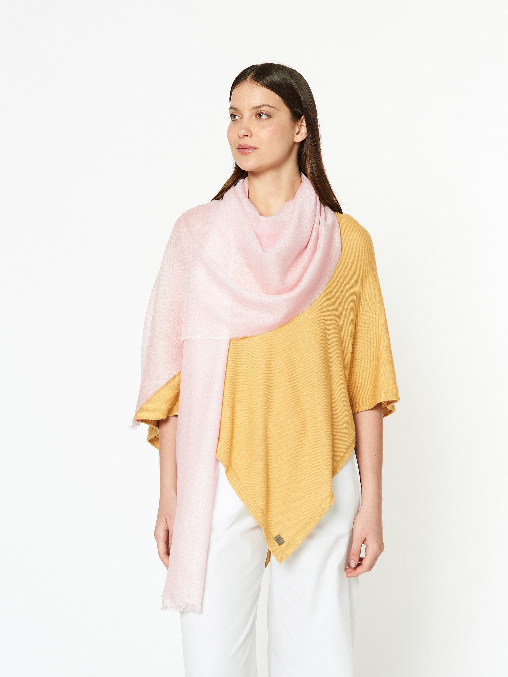 Estola Plano Zapareli en tonalidad rosado, confeccionada en una mezcla de baby alpaca, seda y tencel. Presenta una textura tipo crepé, con un acabado suave, ligero y delicado, ideal para complementar cualquier look con elegancia. | Material predominante: Tencel