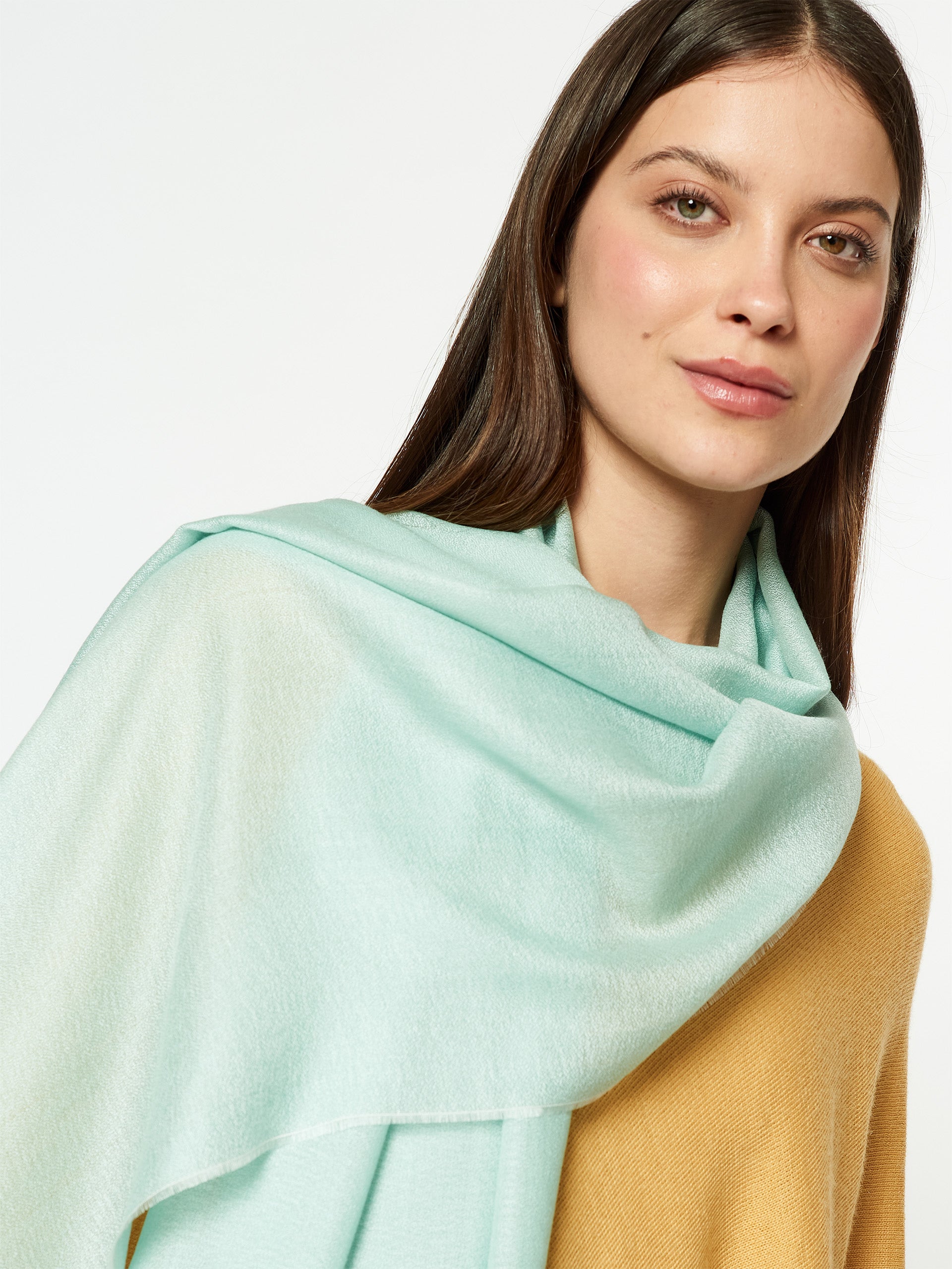 Estola Plano Zapareli en tonalidad verde, confeccionada en una mezcla de baby alpaca, seda y tencel. Presenta una textura tipo crepé, con un acabado suave, ligero y delicado, ideal para complementar cualquier look con elegancia. | Material predominante: Tencel