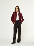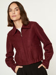 Casaca Tana en tonalidad guinda, confeccionada en tela felted de alpaca y lana. Esta prenda de estilo crop presenta un diseño moderno con cuello camisero y cierre metálico frontal. Destaca por sus amplios bolsillos de parche laterales y una pretina con elástico recogido que define la silueta y aporta un aire contemporáneo. | Material predominante: Alpaca y Lana