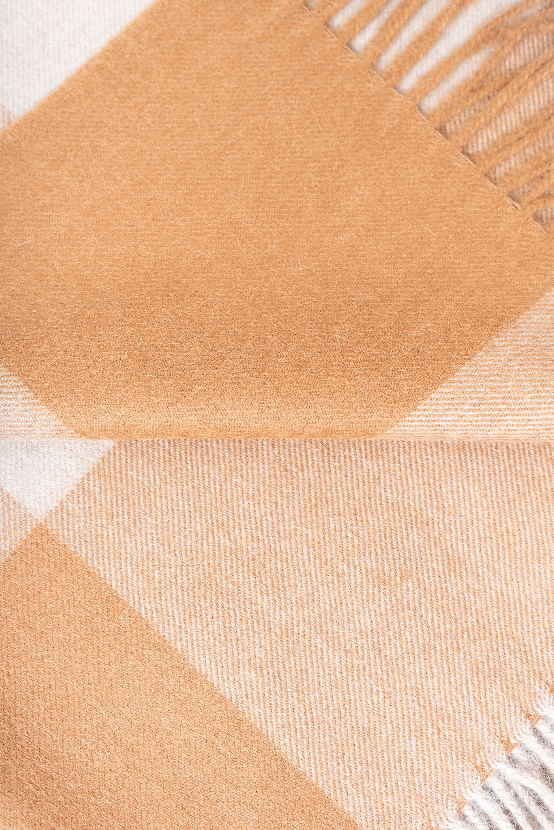 Nuestra manta Alpaca 155 en color beige esta elaborada en 100% baby alpaca, presenta diseño a cuadros en tonos neutros y flecos. Suave, cálida y lujosa