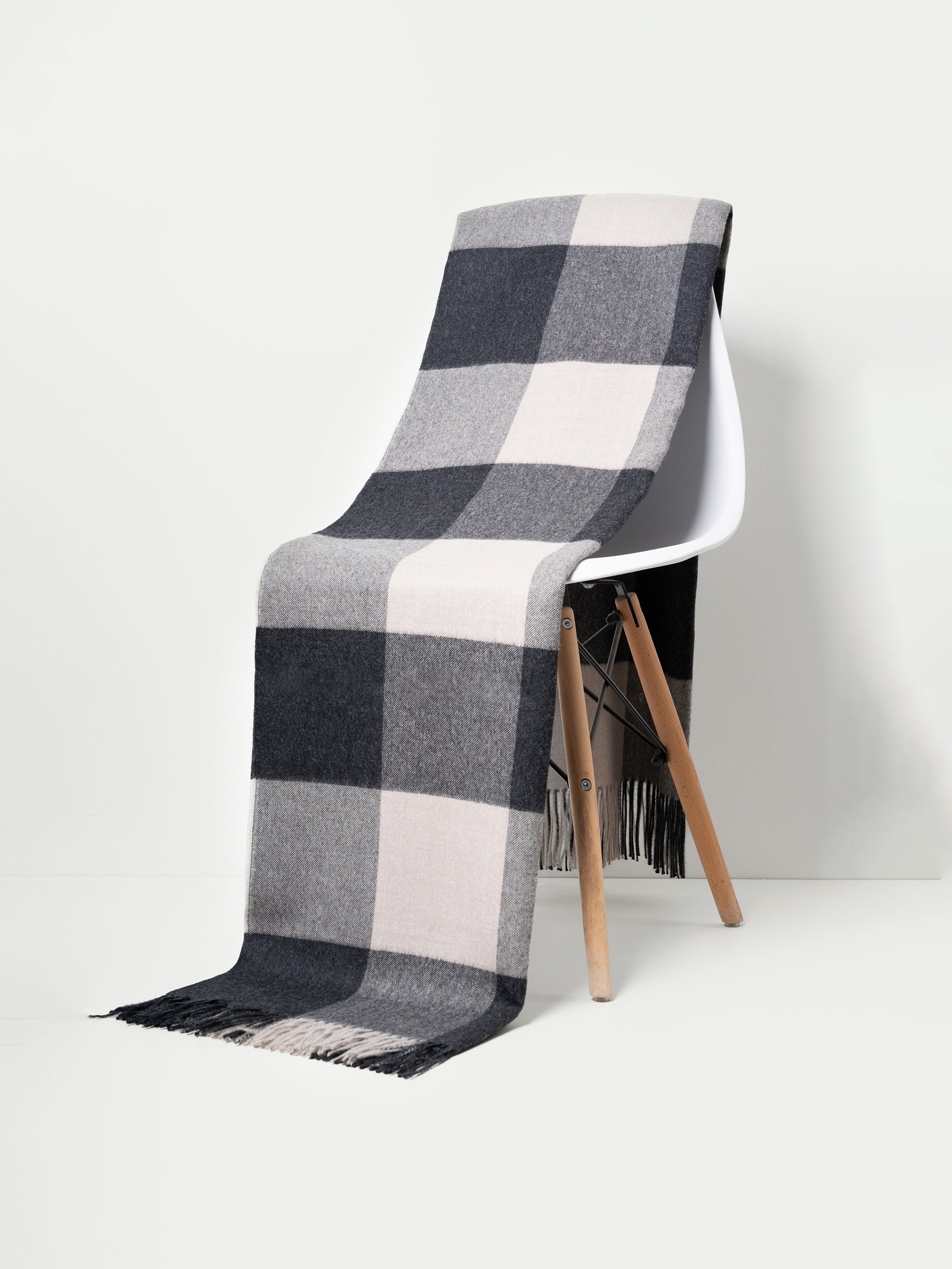 Nuestra manta Alpaca 155 en color negro / blanco esta elaborada en 100% baby alpaca, presenta diseño a cuadros en tonos neutros y flecos. Suave, cálida y lujosa