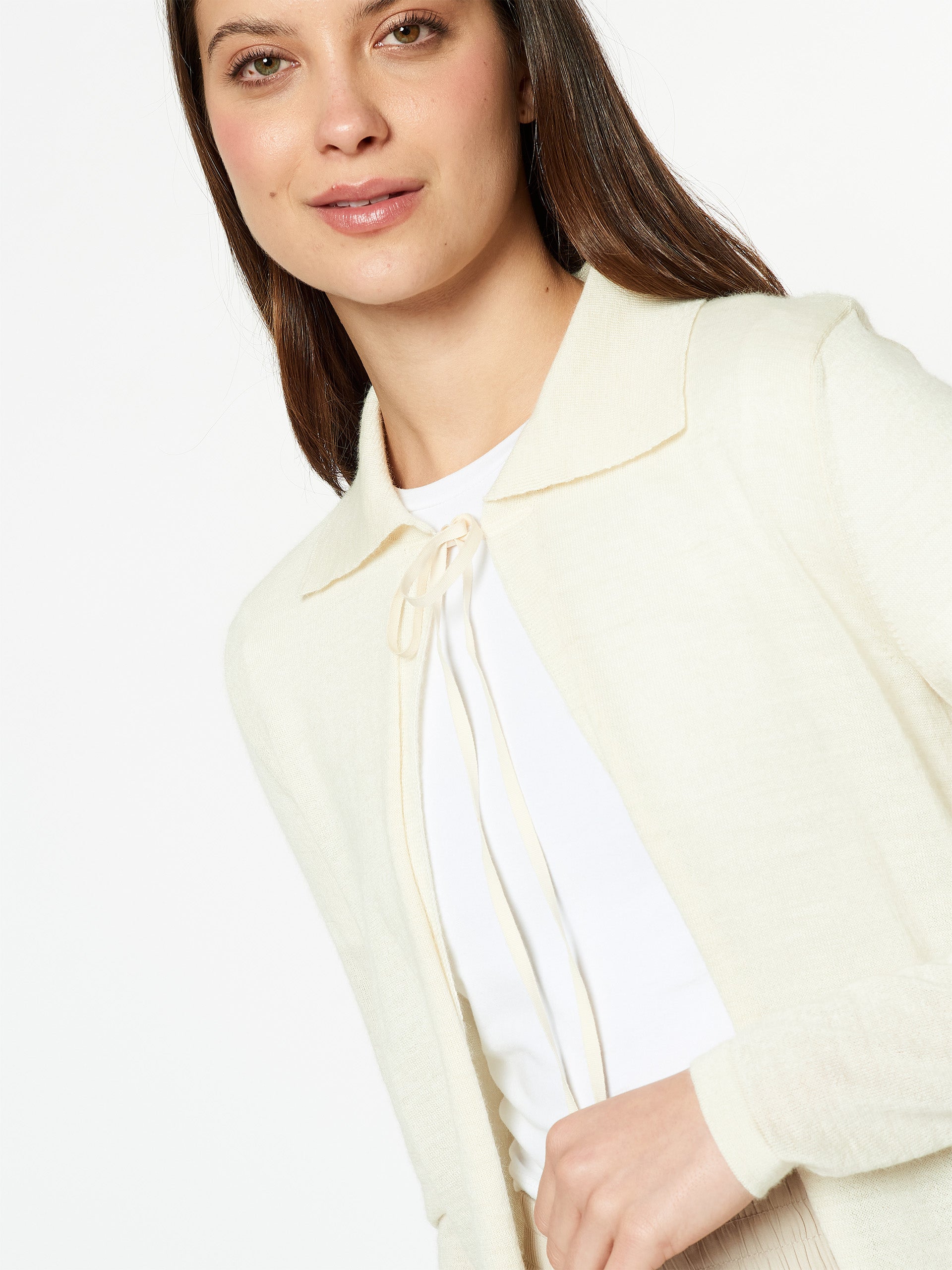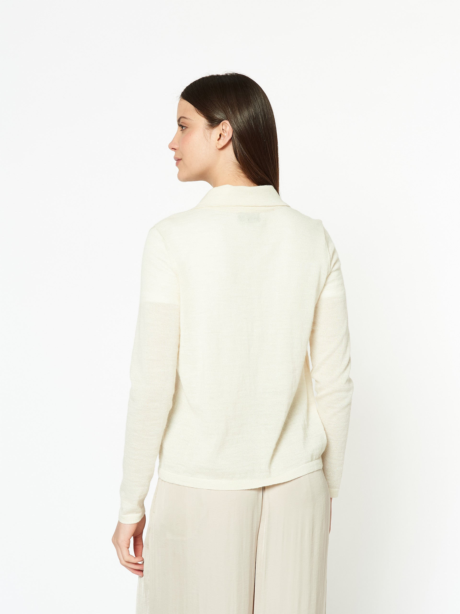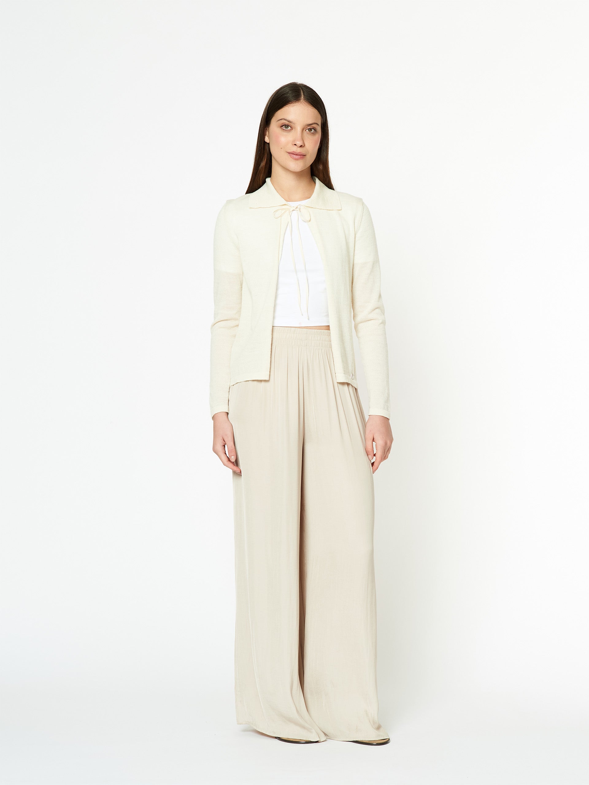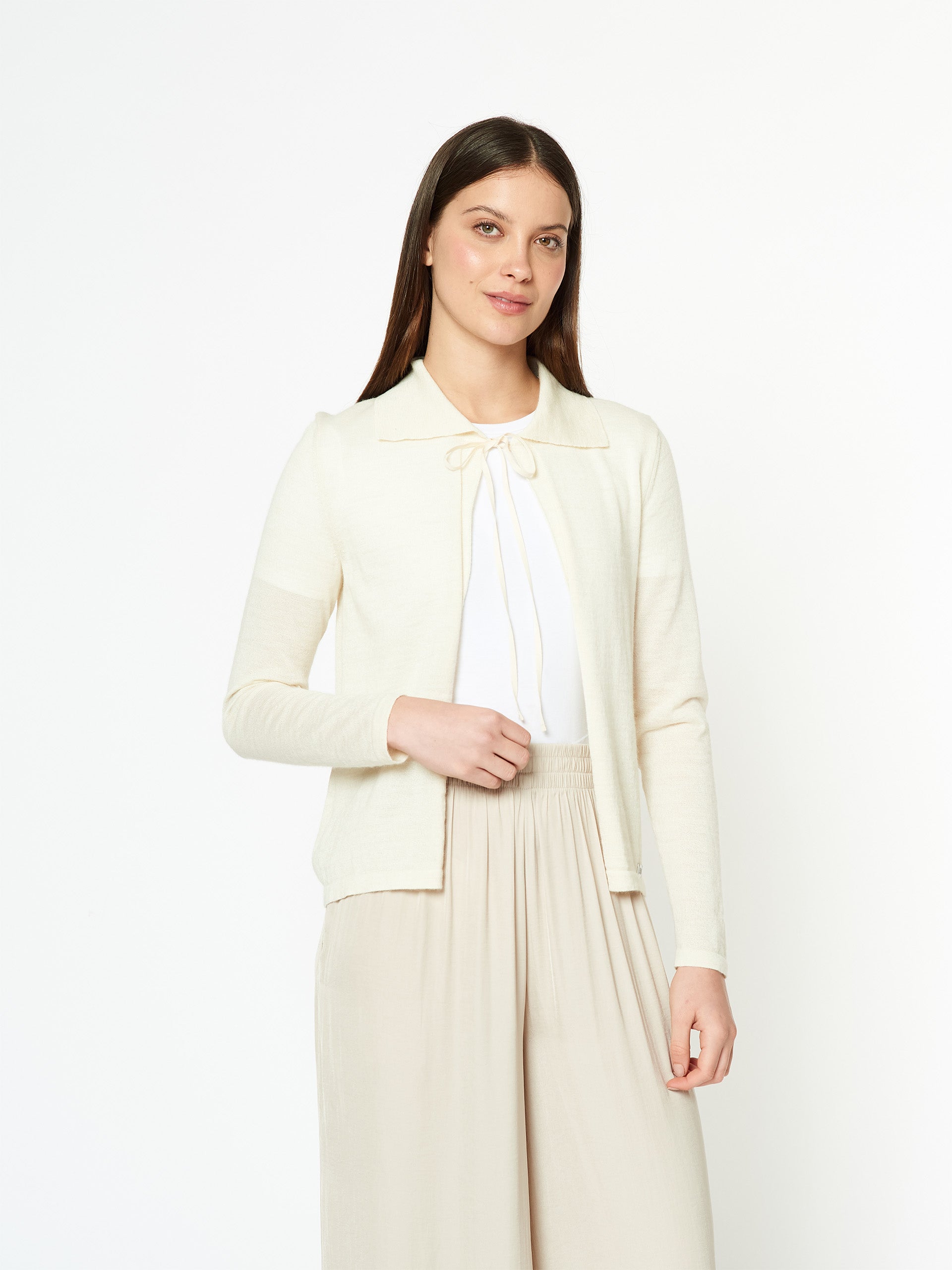 Cardigan Mármora en tonalidad ecru, confeccionado en 100% baby alpaca, fibra reconocida por su ligereza, suavidad y calidez. Presenta un cuello tipo polo y cintas frontales que se anudan para cerrar la prenda, ofreciendo un estilo delicado y contemporáneo. | Material predominante: Baby Alpaca