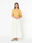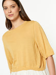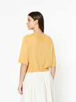 Suéter Dodici en tonalidad amarillo, confeccionado en 100% baby alpaca. Su diseño ligero de cuello redondo y manga 3/4 presenta una silueta relajada y corta, con buena caída y un estilo moderno que combina comodidad y suavidad natural. | Material predominante: Baby Alpaca