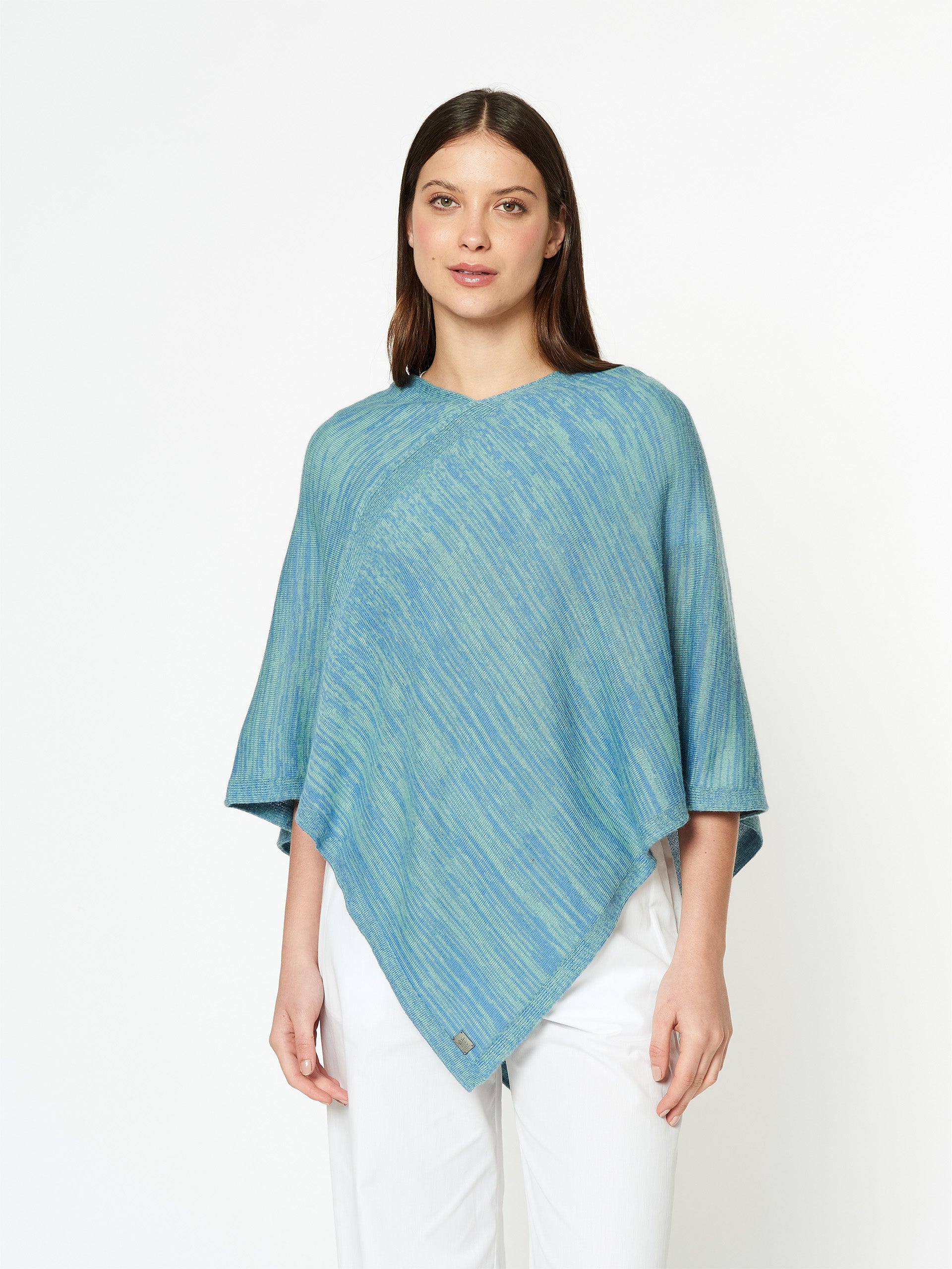 Capa Maglic en tonalidad turquesa y azul, confeccionada en 100% baby alpaca. Presenta un efecto jaspeado en dos colores, que resalta la textura natural de la fibra y aporta un estilo distintivo y elegante. | Material predominante: Baby Alpaca