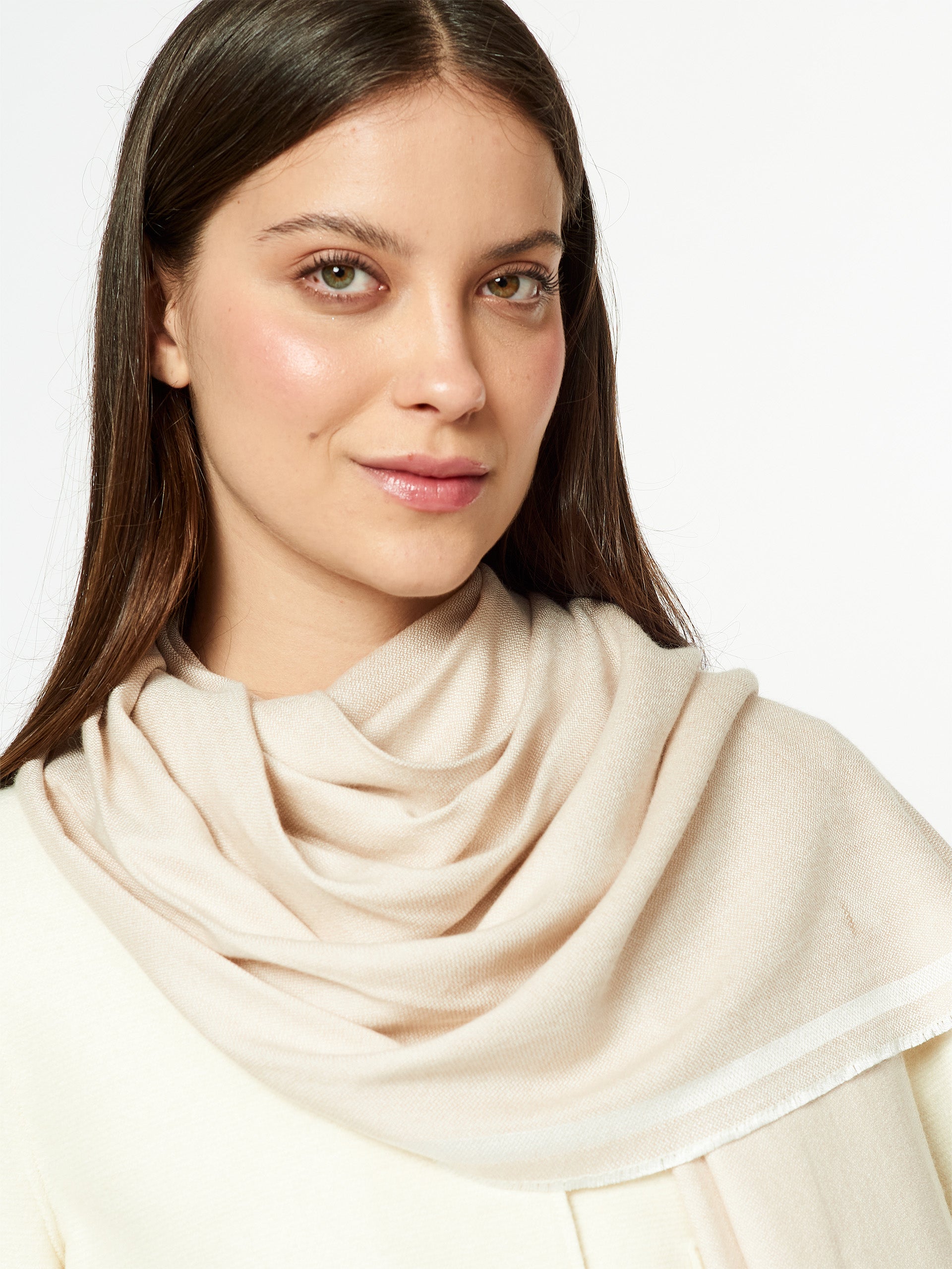 Estola Plano Tunari en tonalidad beige, confeccionada en una mezcla de bambú, baby alpaca y seda. De textura ligera, presenta detalles en color contraste en los bordes y un brillo natural que realza su aspecto suave y elegante. | Material predominante: Bamboo