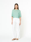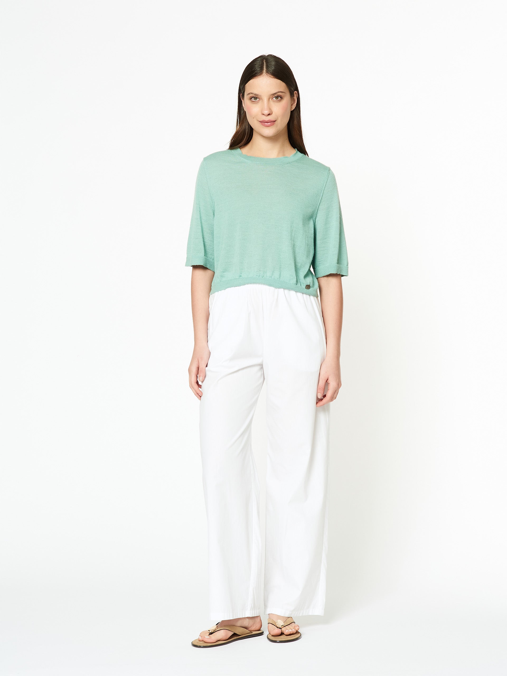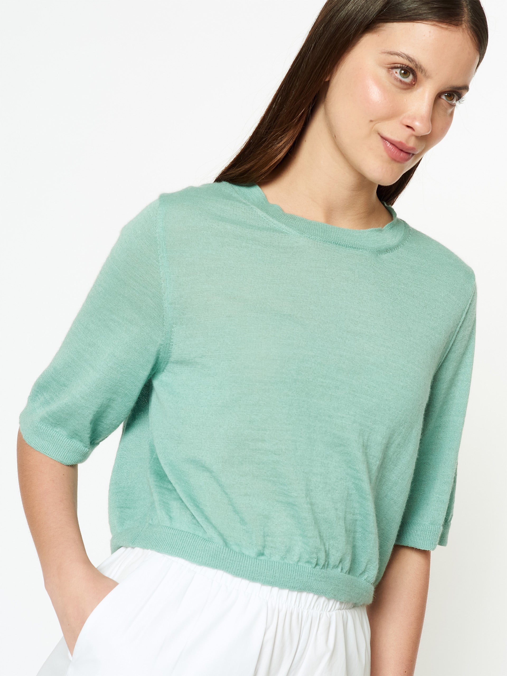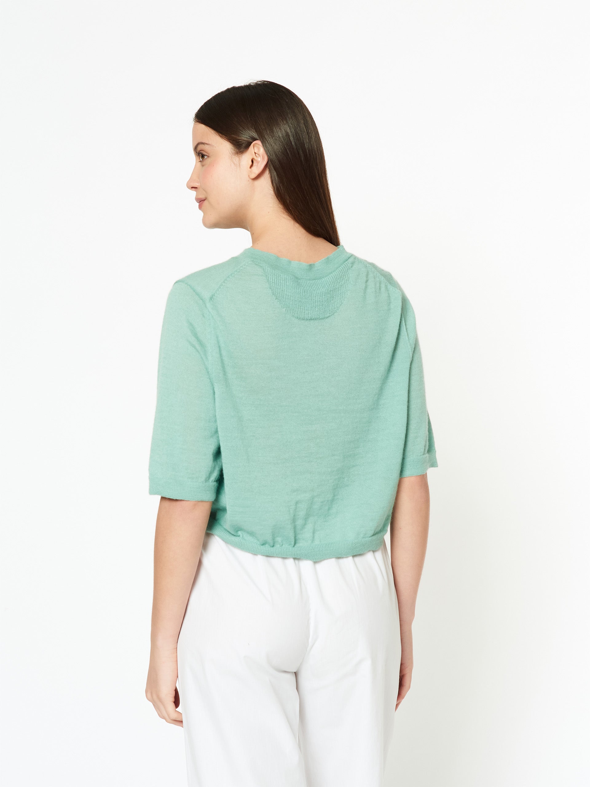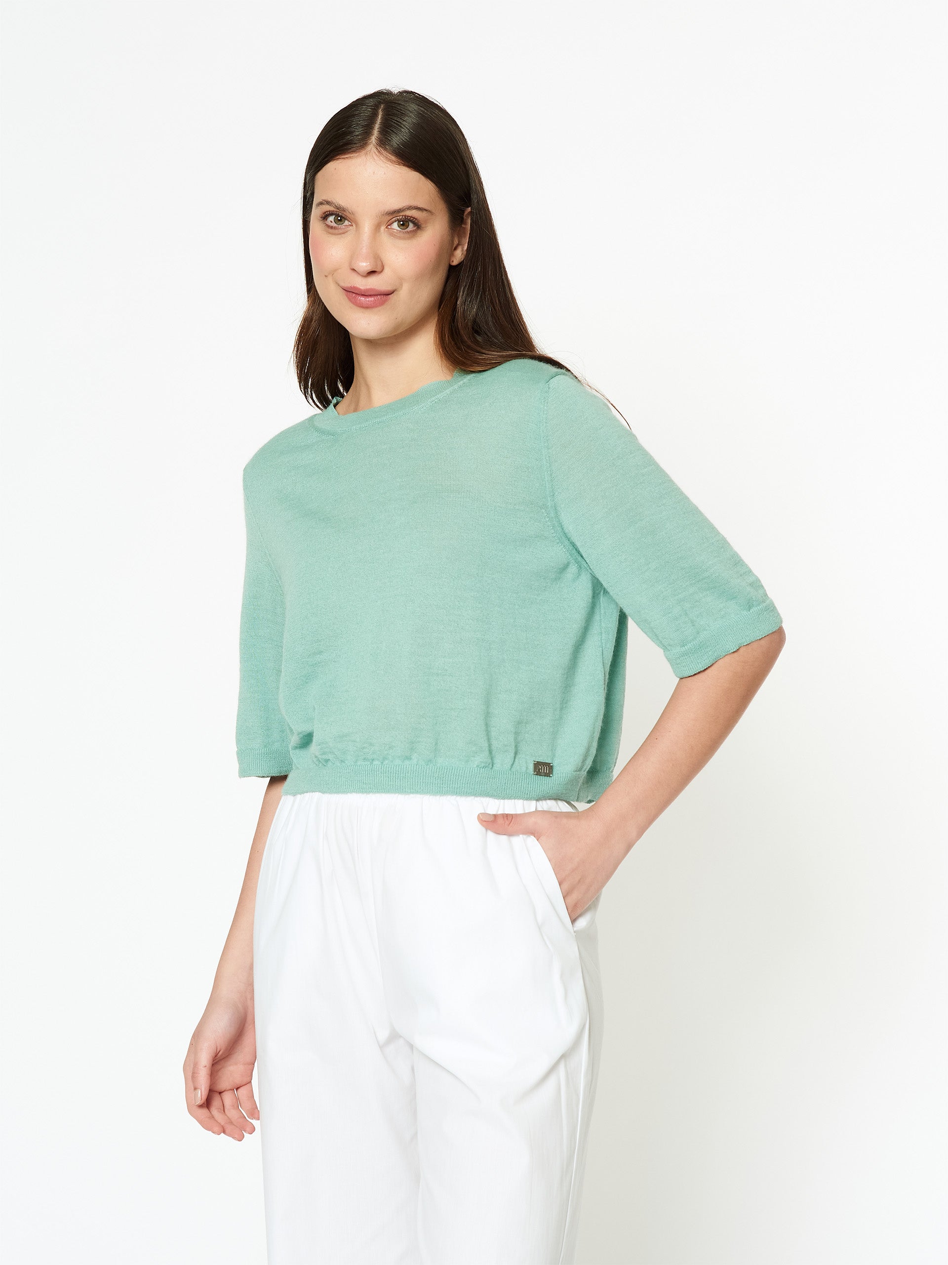 Suéter Dodici en tonalidad turqueza, confeccionado en 100% baby alpaca. Su diseño ligero de cuello redondo y manga 3/4 presenta una silueta relajada y corta, con buena caída y un estilo moderno que combina comodidad y suavidad natural. | Material predominante: Baby Alpaca