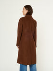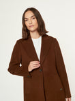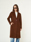 Abrigo Lucania en tonalidad chocolate, confeccionado en una lujosa mezcla de baby alpaca y lana. Presenta un diseño clásico de corte largo con solapa en muesca y cierre frontal de un solo botón a contraste. Incluye bolsillos laterales con tapeta y una silueta estructurada que ofrece máxima elegancia y calidez. | Material predominante: Alpaca