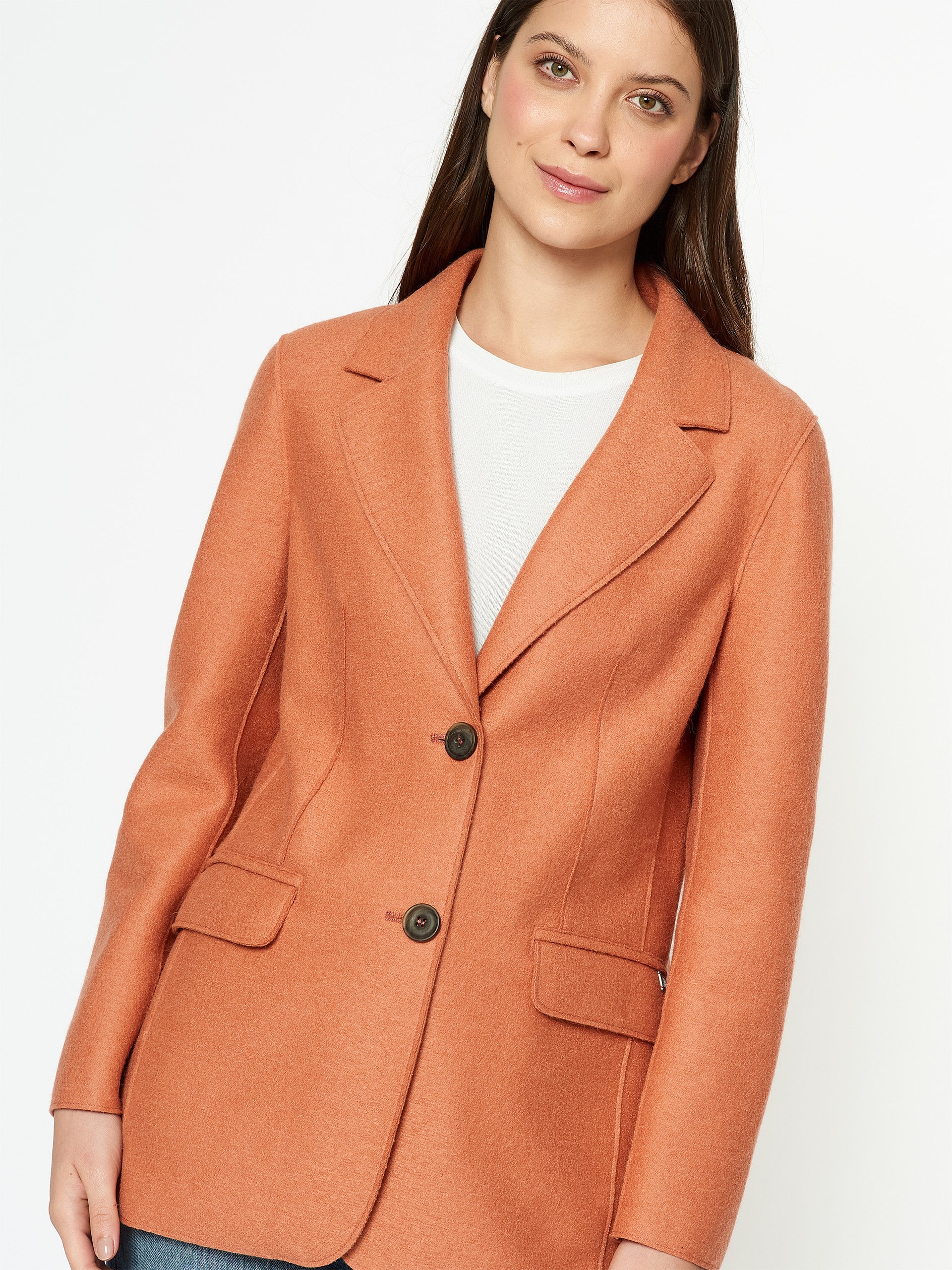 Blazer Midzor en tonalidad naranja, confeccionado en una mezcla de alpaca y lana. De corte semi entallado, está elaborado en tela felted ligera y cuenta con bolsillos con tapeta, que aportan un acabado elegante y contemporáneo. | Material predominante: Lana