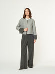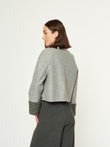 Casaca Chandra en tonalidad gris, confeccionada en mezcla de alpaca y lana. Esta prenda de estilo crop presenta un diseño minimalista con cuello redondo y cierre metálico frontal. Destaca por sus mangas ranglan que terminan en puños anchos elaborados en tela bouclé a contraste, aportando una textura única y un aire contemporáneo a la silueta. | Material predominante: Alpaca y Lana