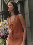 Chaleco Spathi en tonalidad naranja, confeccionado en 100% baby alpaca, fibra que ofrece suavidad y calidez natural. Presenta un diseño tejido con cintas de algodón que se anudan para cerrar la prenda, aportando un toque artesanal y delicado. | Material predominante: Baby Alpaca