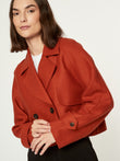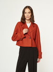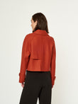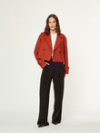 Saco Shanti en tonalidad ladrillo, confeccionado en mezcla de alpaca y lana. Esta prenda de estilo crop y diseño asimétrico destaca por su doble cruce frontal y solapas en muesca. Incluye detalles únicos como una tapeta decorativa redondeada en el pecho y martingalas en los puños, ofreciendo un look moderno y sofisticado. | Material predominante: Alpaca y Lana