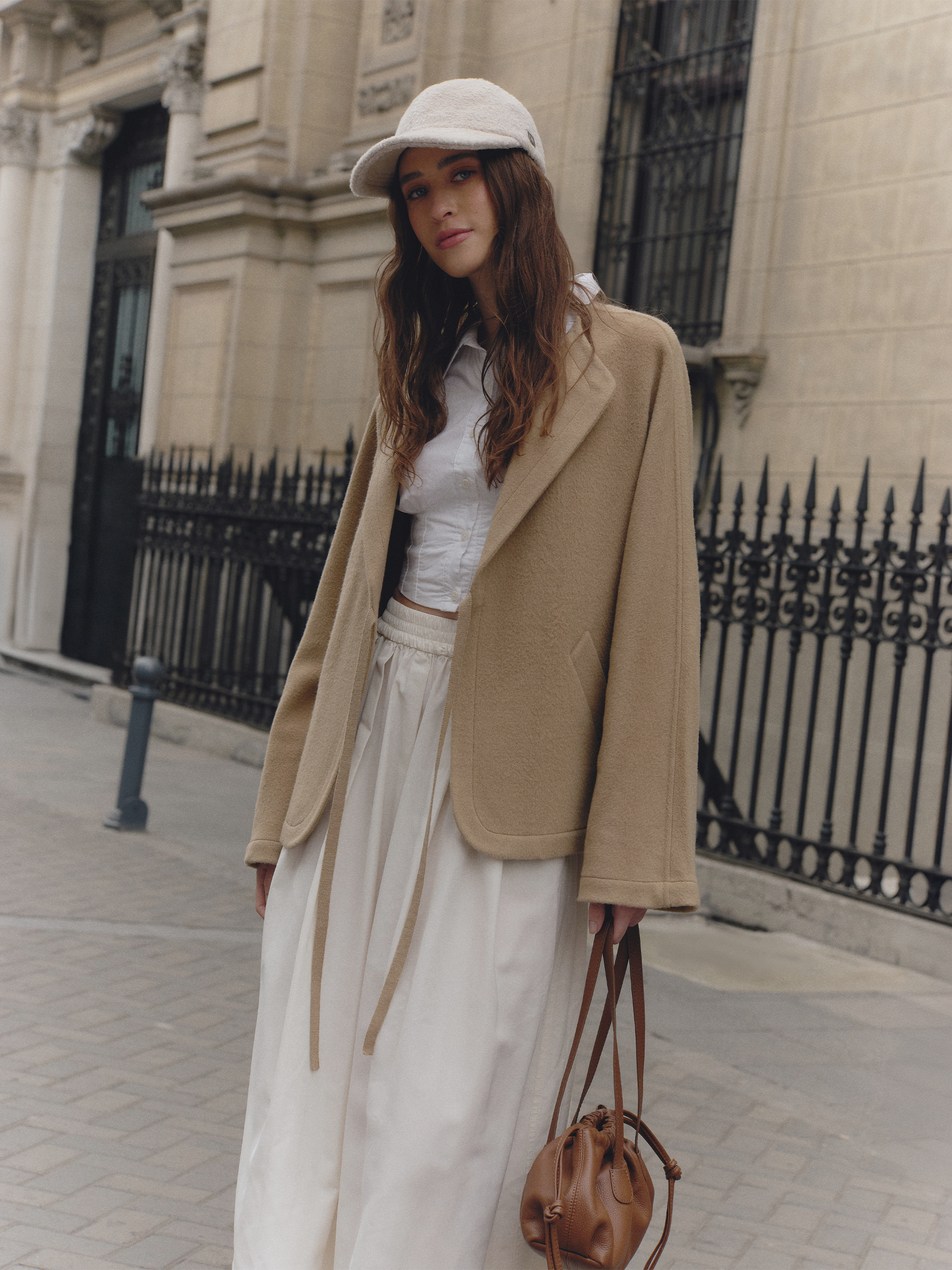 Saco Veleta en tonalidad beige, confeccionado en una mezcla de baby alpaca y lana, que aporta textura, calidez y suavidad. De corte boxy fit con mangas ligeramente acampanadas, se cierra con dos tiras de tejido en punto. No lleva forro y cuenta con bolsillos con tapeta, ofreciendo un estilo moderno y estructurado con acabado artesanal. | Material predominante: Baby Alpaca