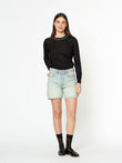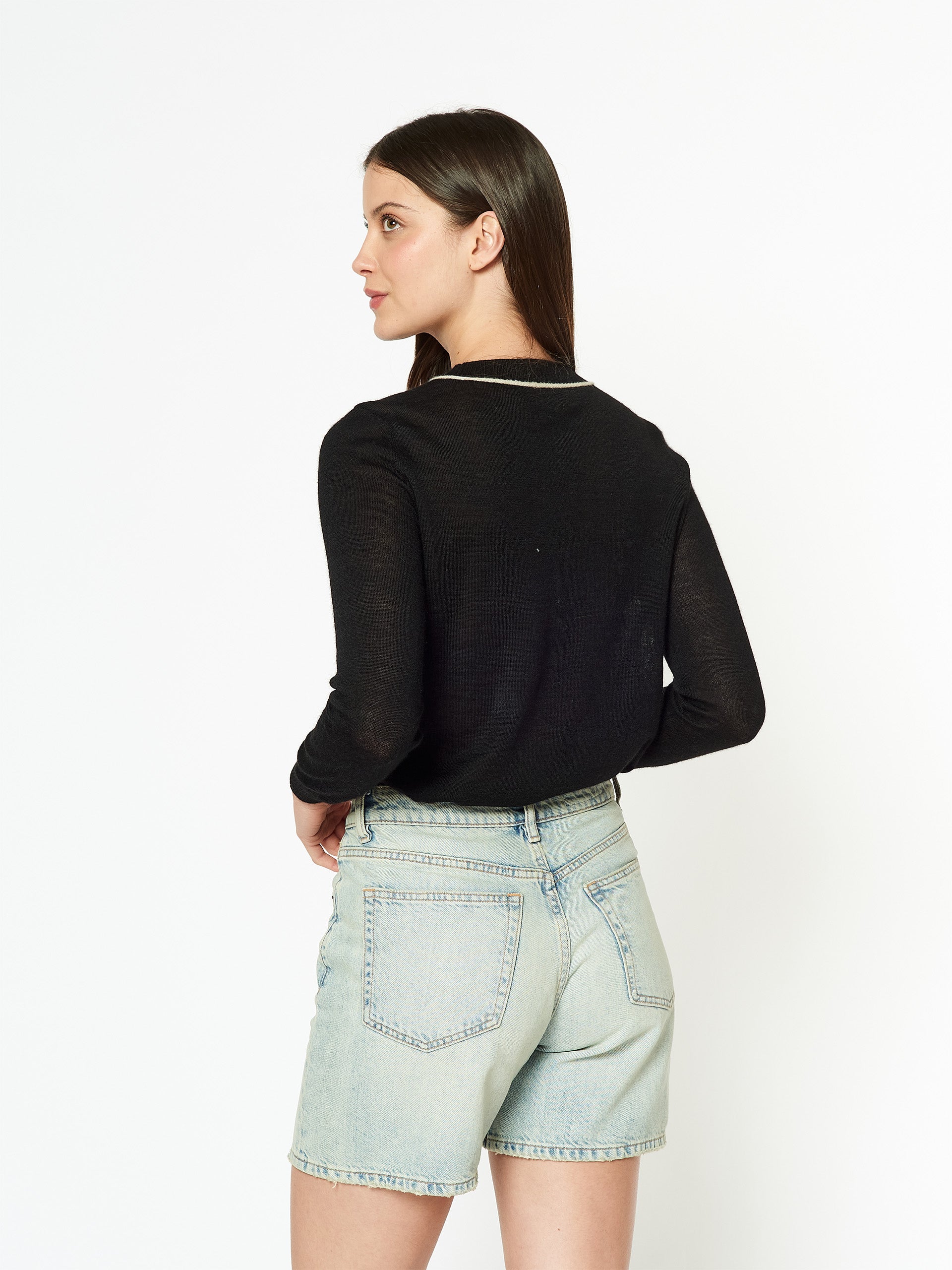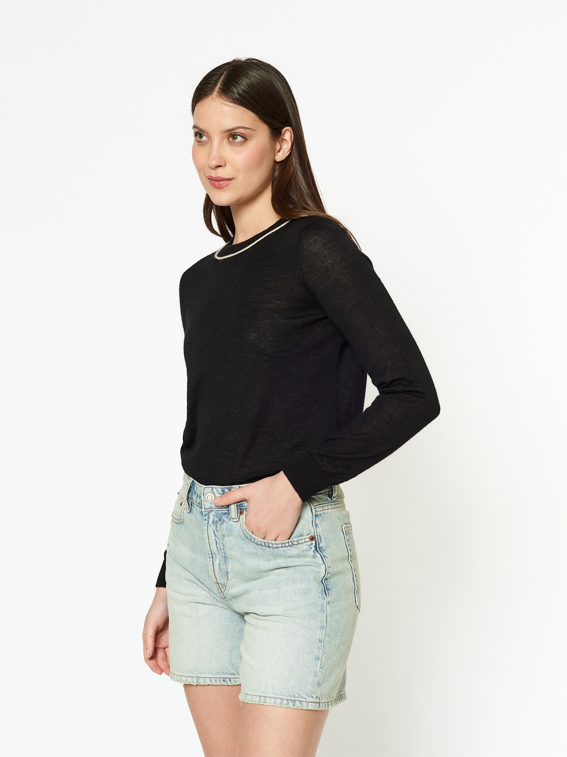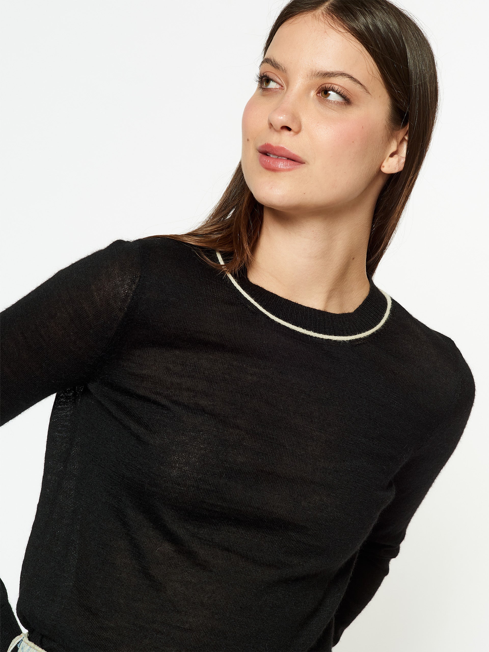 Suéter Peleaga en tonalidad negro, confeccionado en 100% baby alpaca, fibra suave, ligera y cálida. De silueta clásica con cuello redondo, presenta un ribete en color contraste en el cuello que aporta un detalle sutil y elegante. | Material predominante: Baby Alpaca