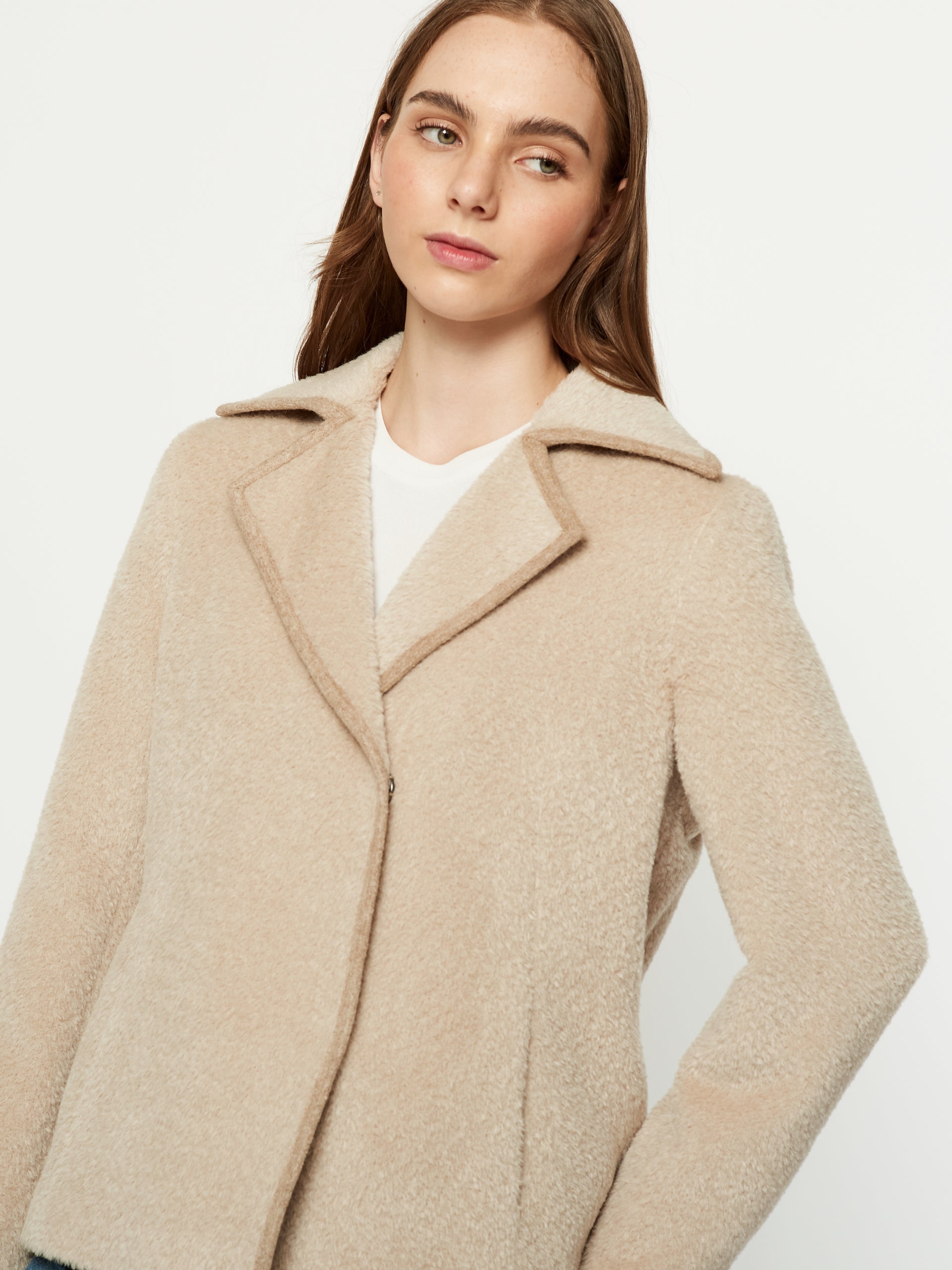 Saco Nuptse en tonalidad beige, destaca por sus detalles de tela felted y bolsillos insertados en la costura, cuenta con forro para mayor confort. Confeccionado en una mezcla de lana y alpaca suri. | Material predominante: Lana