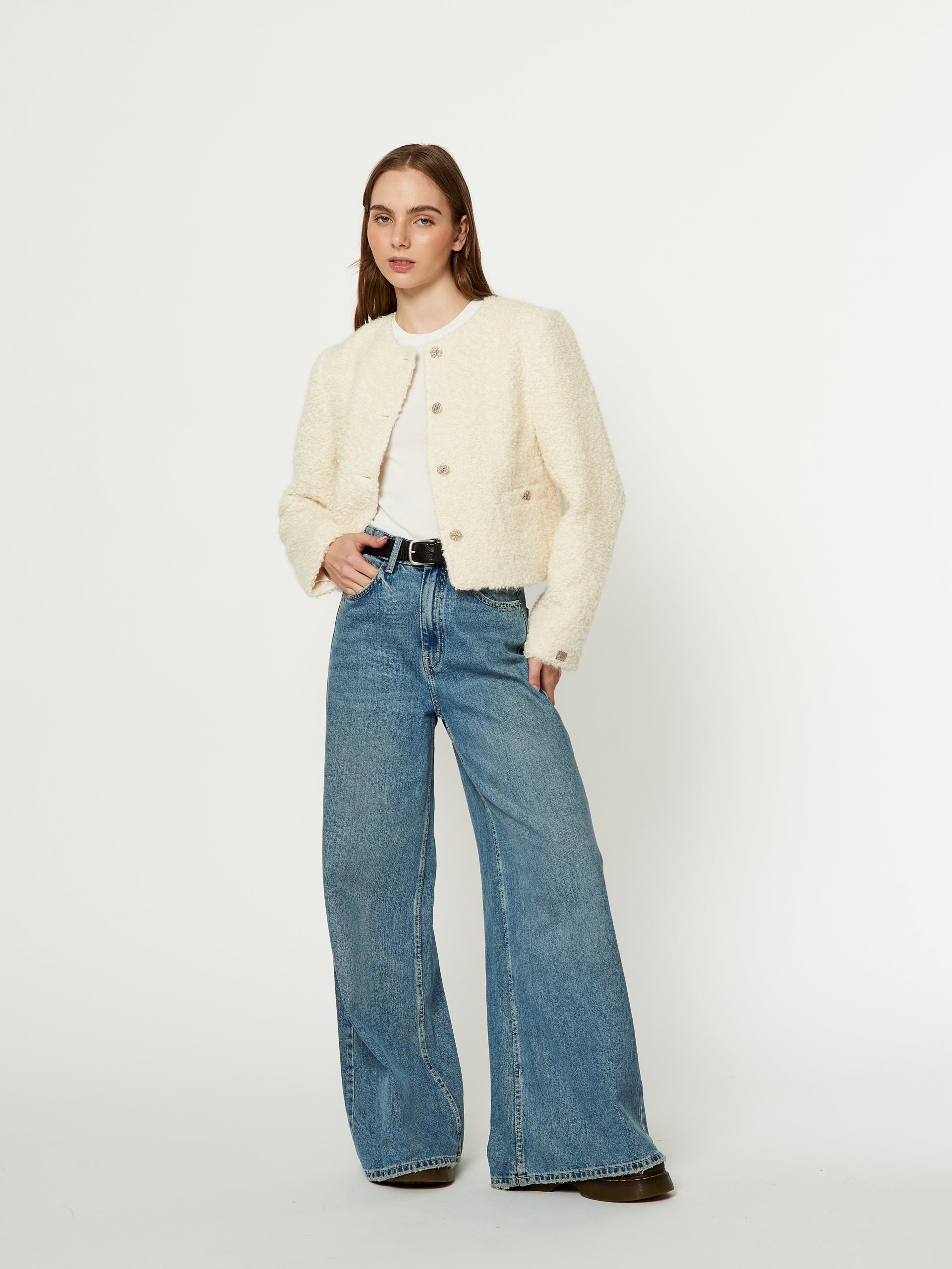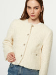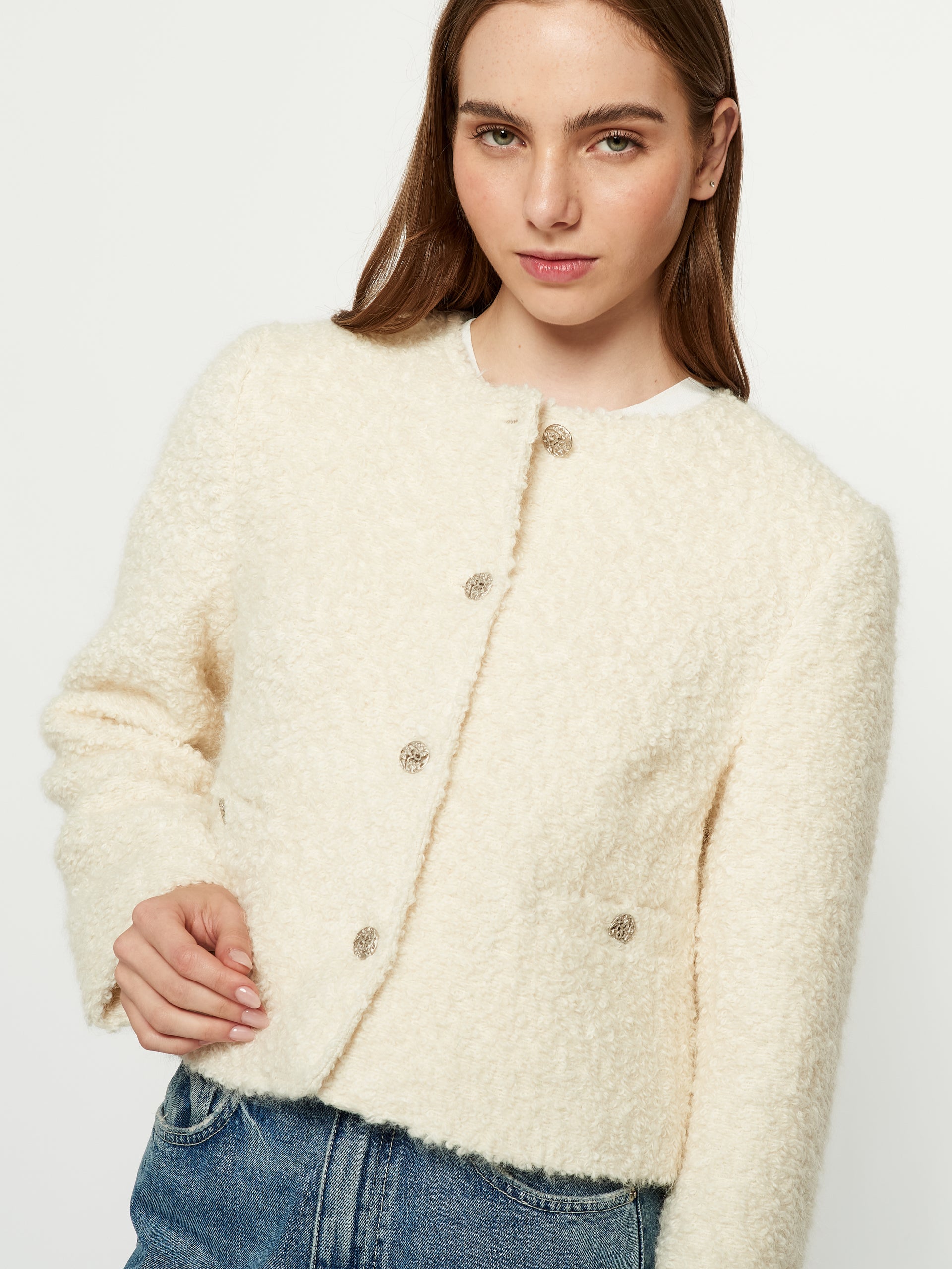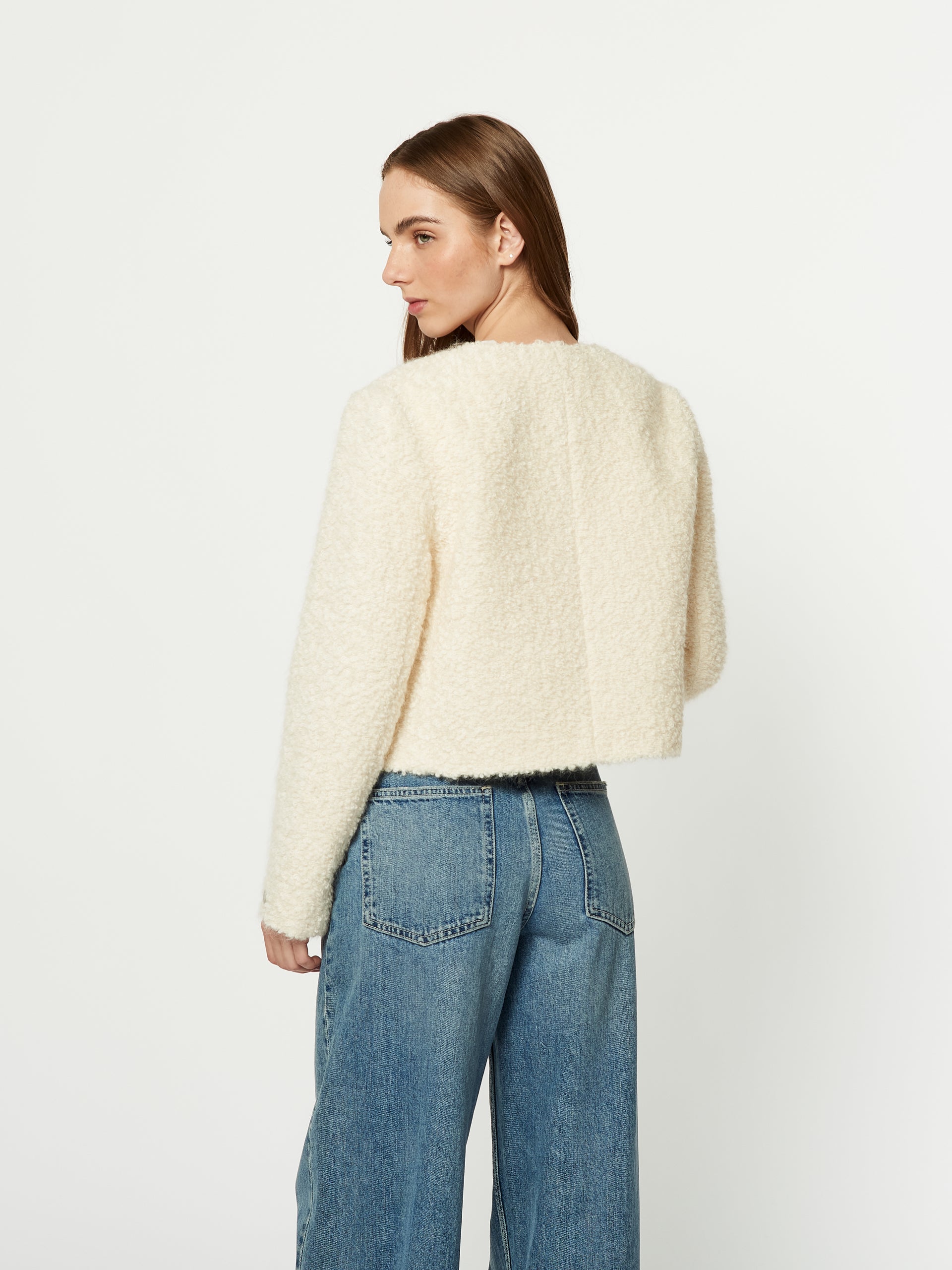Saco Pissis en tonalidad ecru, destaca por su corte crop y tela bouclé, complementado con botones metálicos. Confeccionado en una mezcla de alpaca suri, lana y nylon. | Material predominante: Alpaca