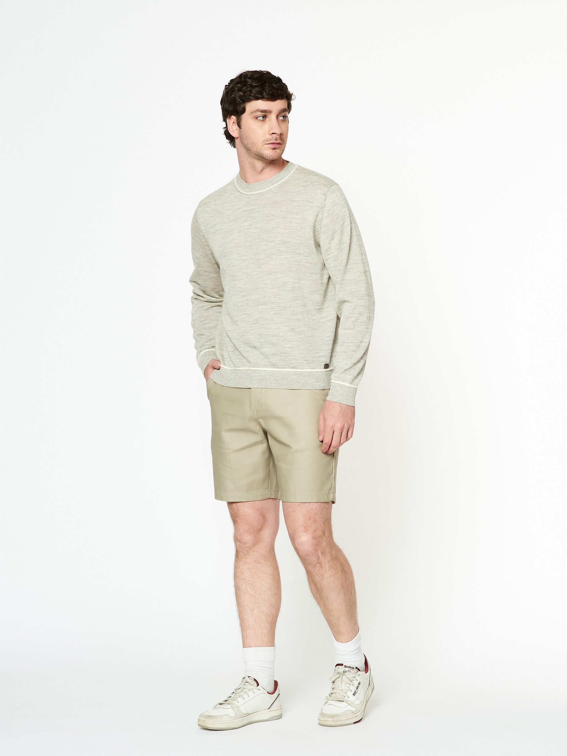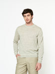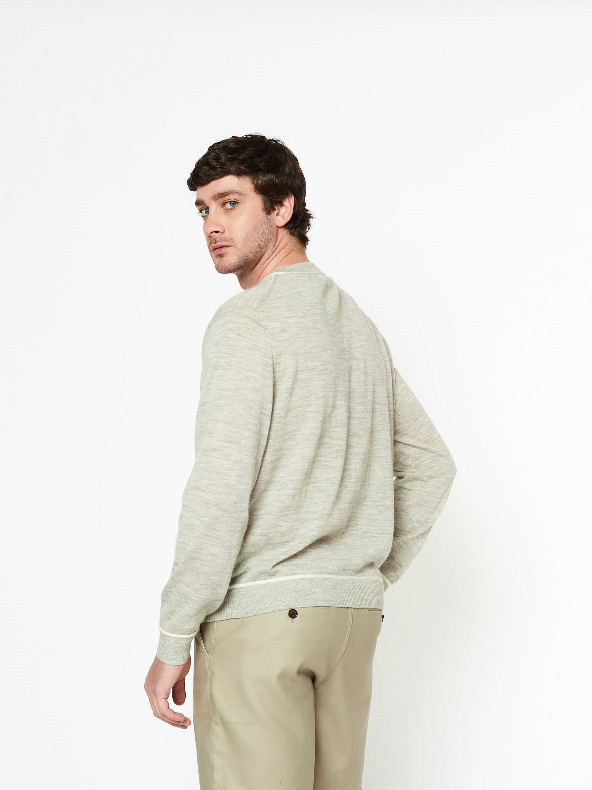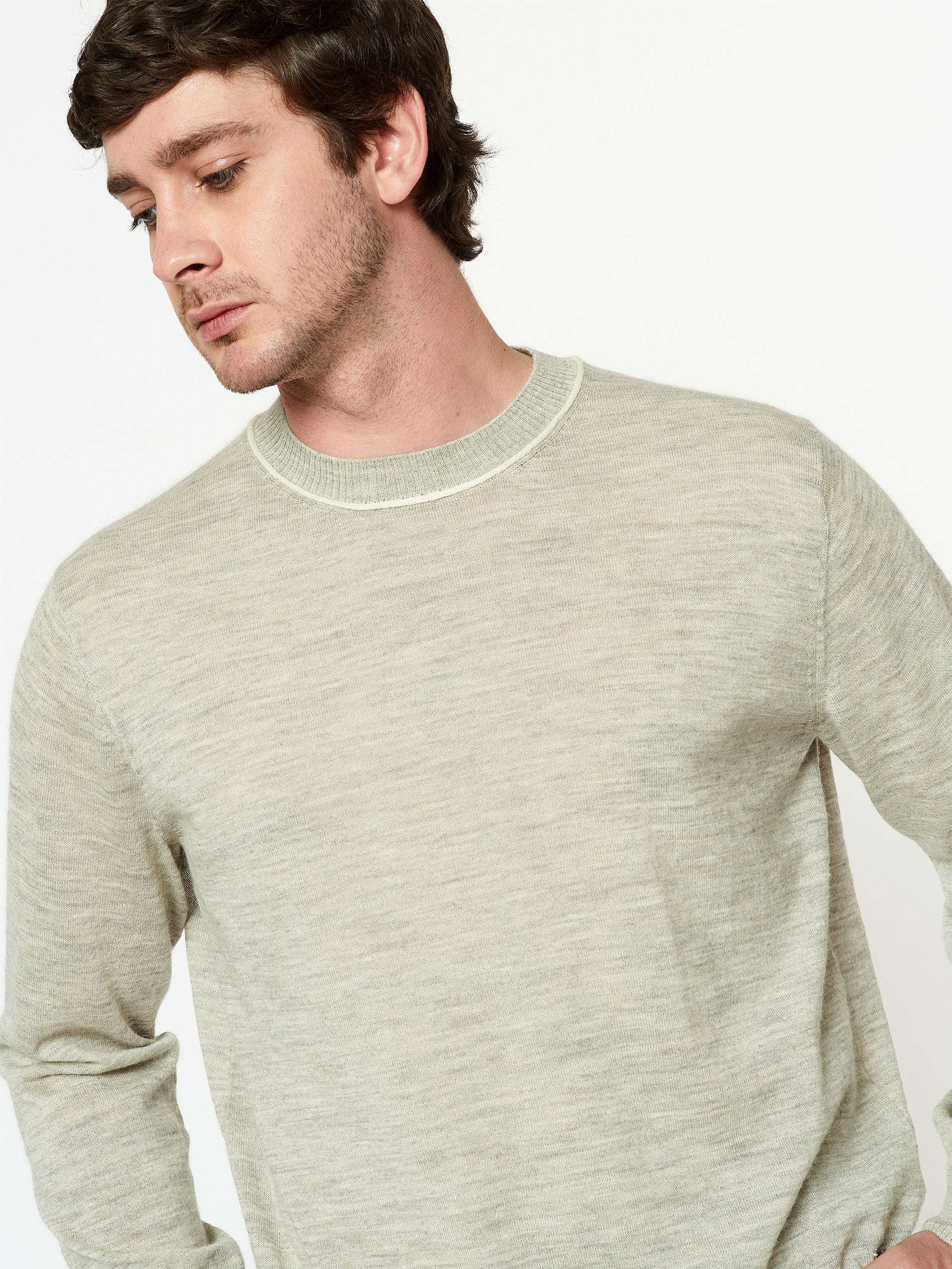 Suéter Pelister en tonalidad gris, confeccionado en 100% baby alpaca, una fibra reconocida por su suavidad, ligereza y calidez natural. Presenta una silueta clásica con ribetes en color contraste en el cuello, los puños y la pretina. Cuenta con cuello redondo y un acabado ligero ideal para cualquier ocasión. | Material predominante: Baby Alpaca