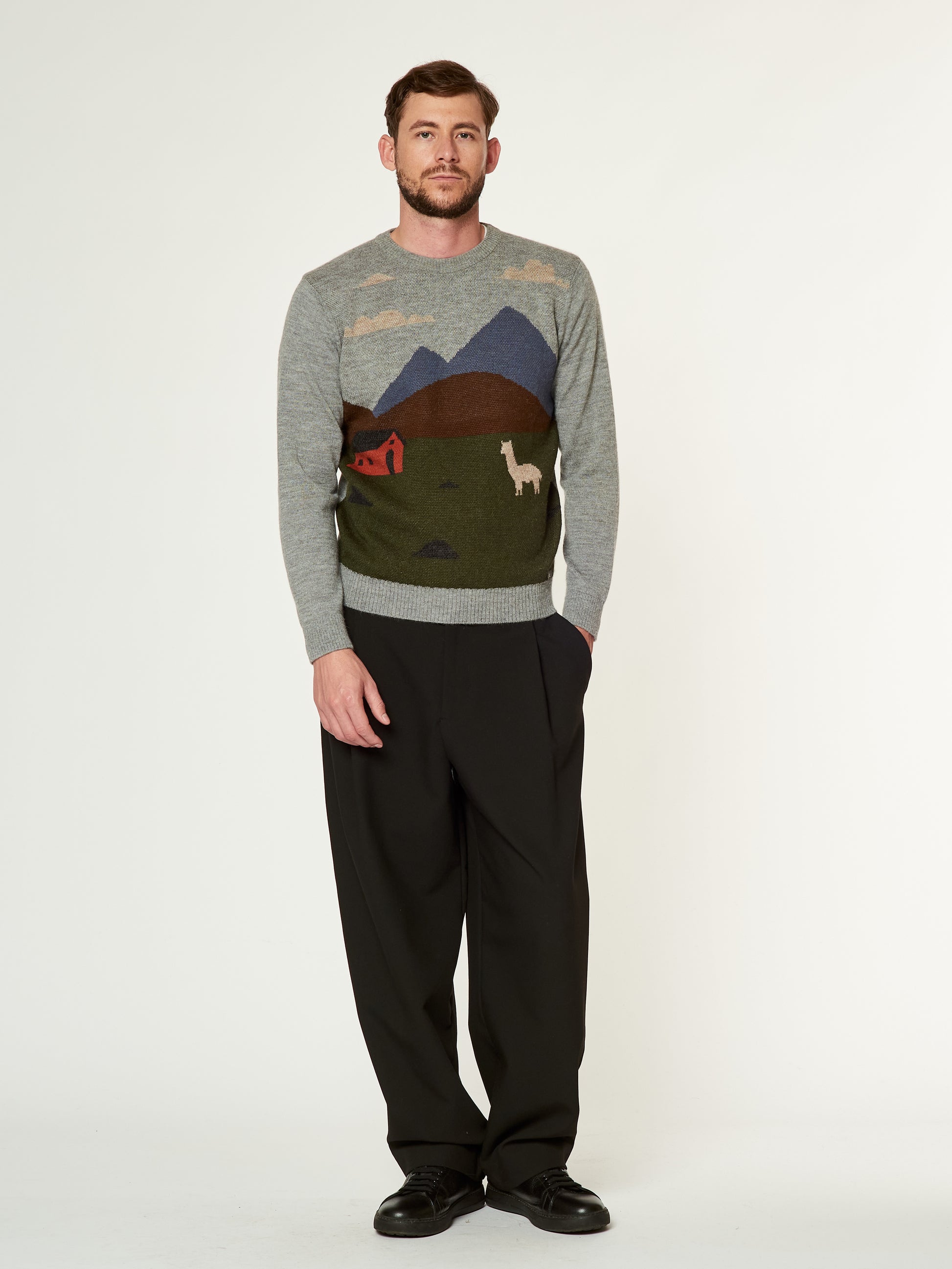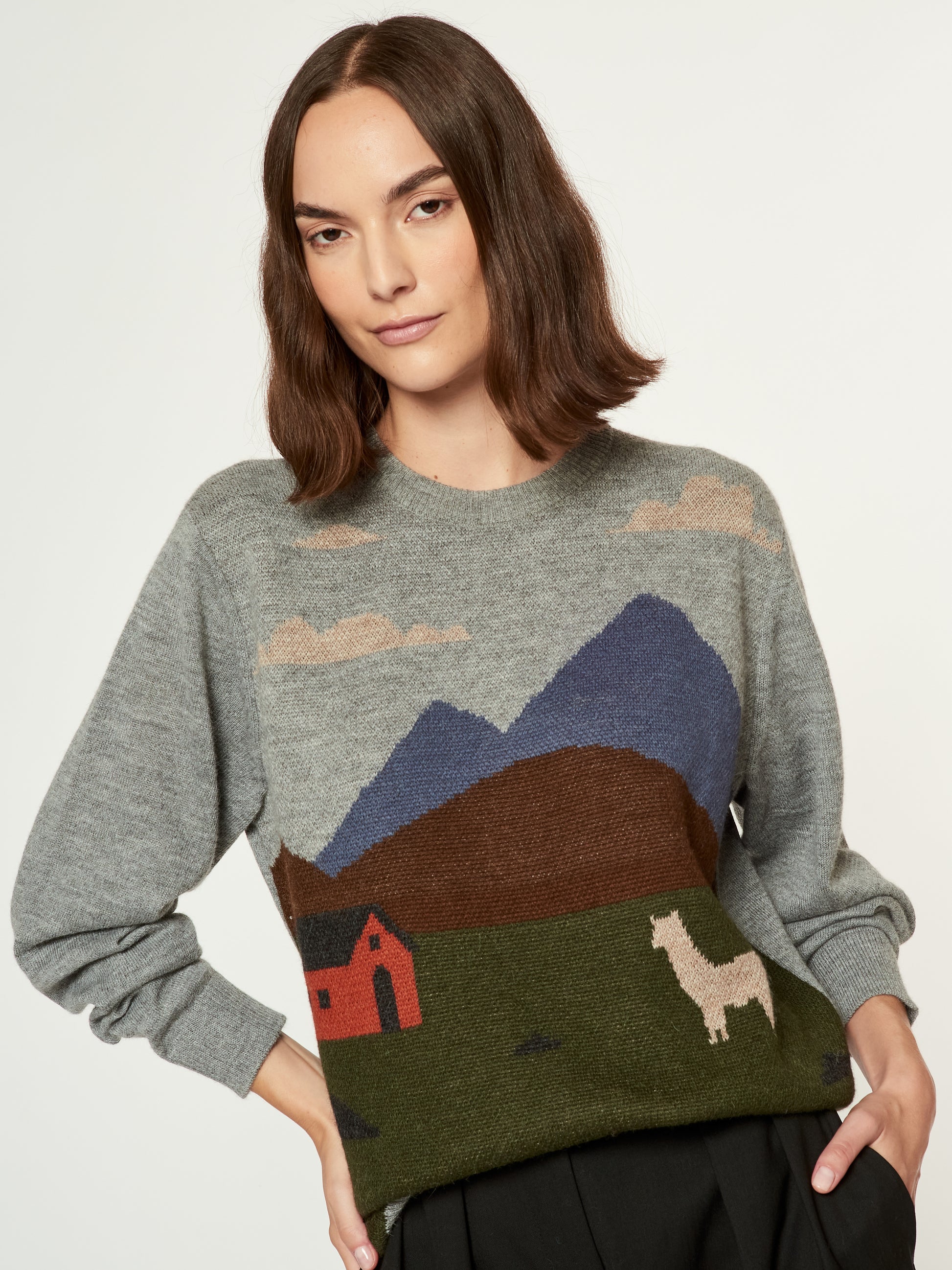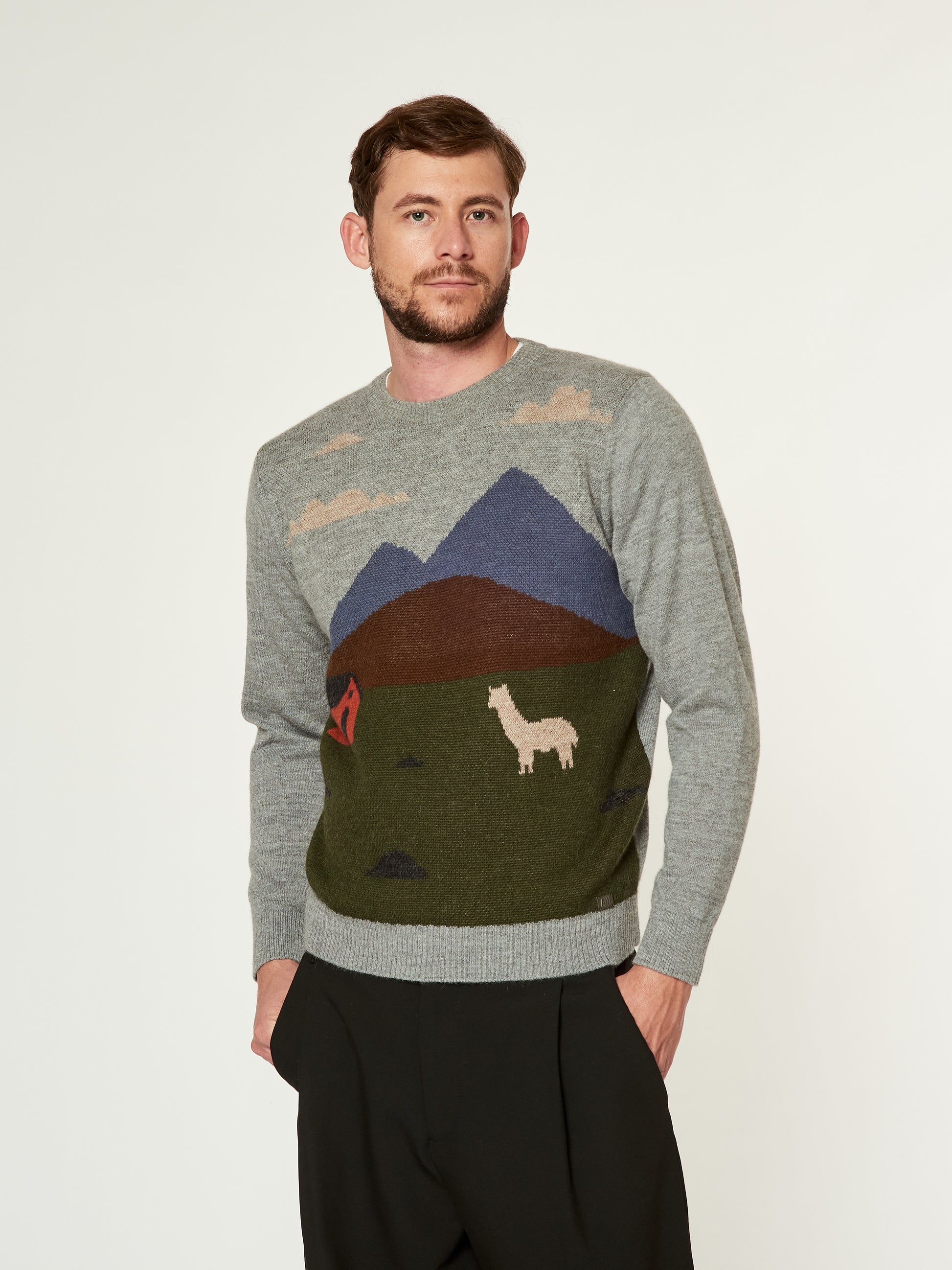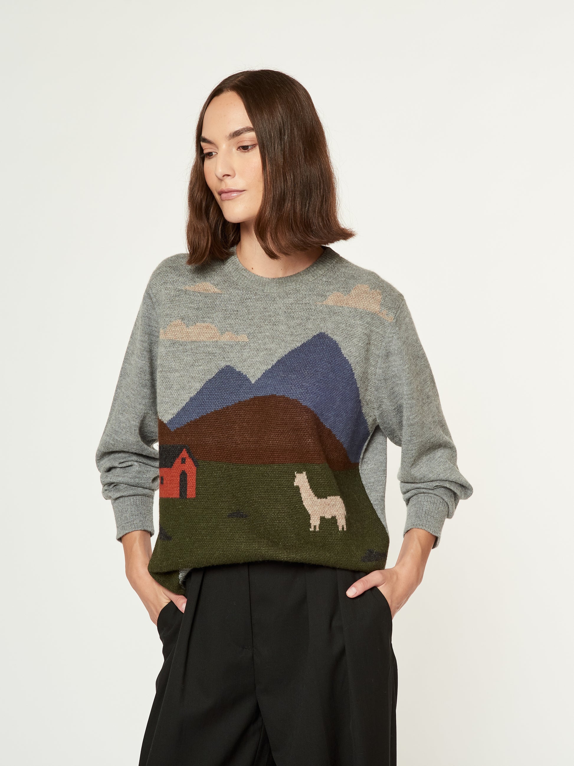 Suéter Langui en tonalidad gris, confeccionado en baby alpaca. Esta prenda unisex destaca por su diseño artístico tejido, inspirado en la cabaña del pastor ubicada en los Andes de Perú. La escena captura la esencia del paisaje andino con detalles de montañas, nubes y una alpaca en un entorno natural. Presenta acabados acanalados en el cuello, puños y basta. | Material predominante: Baby Alpaca