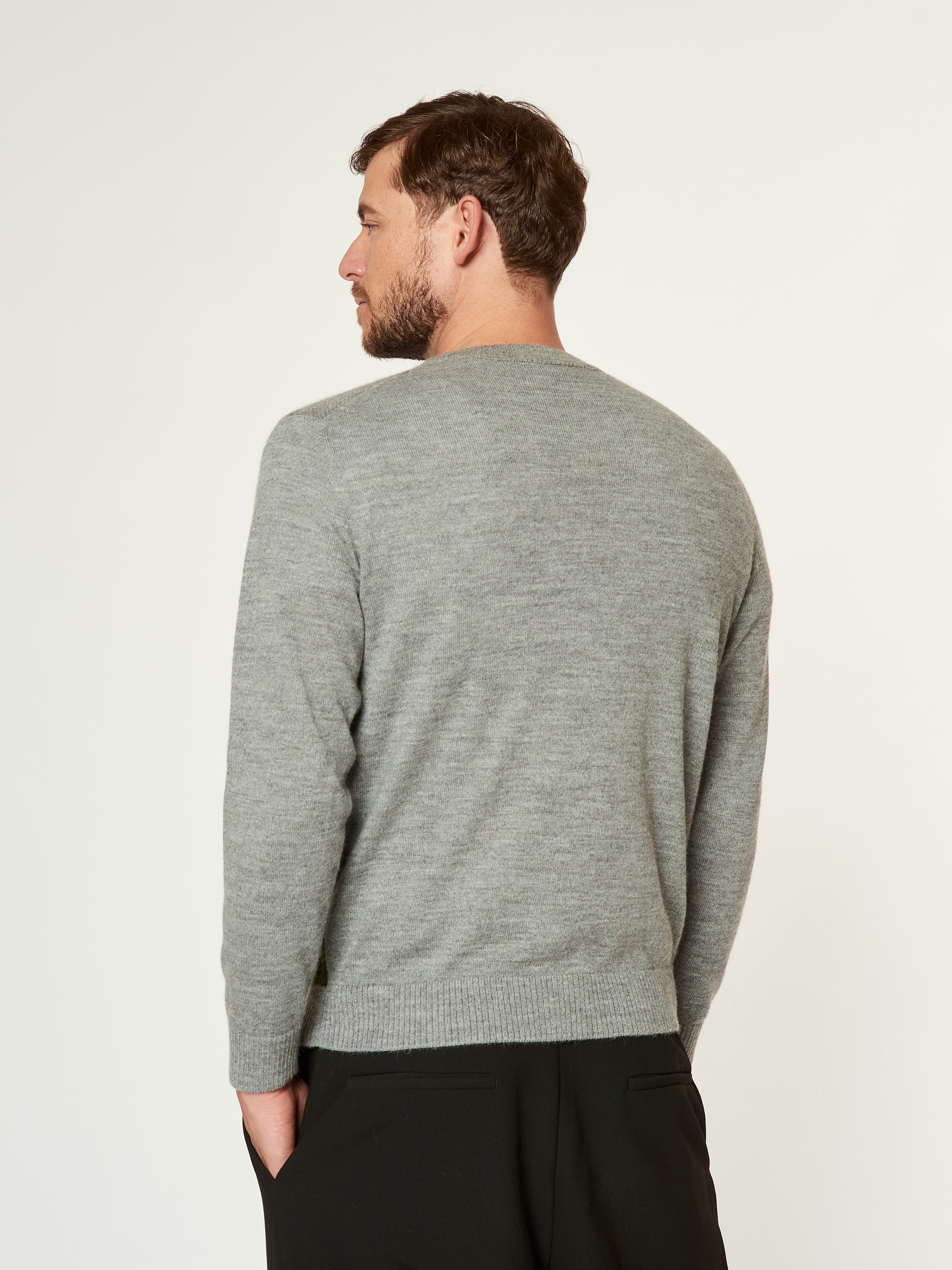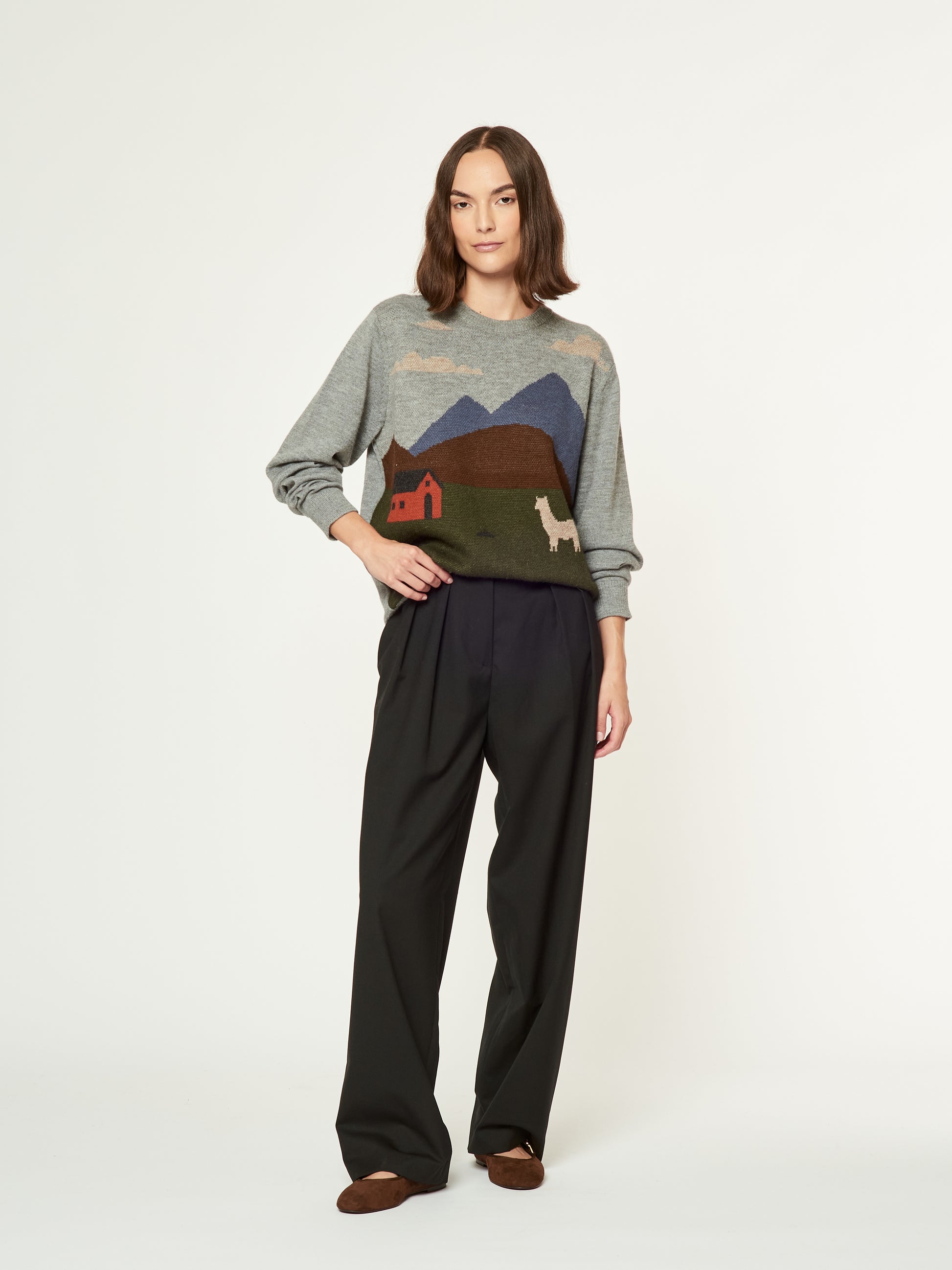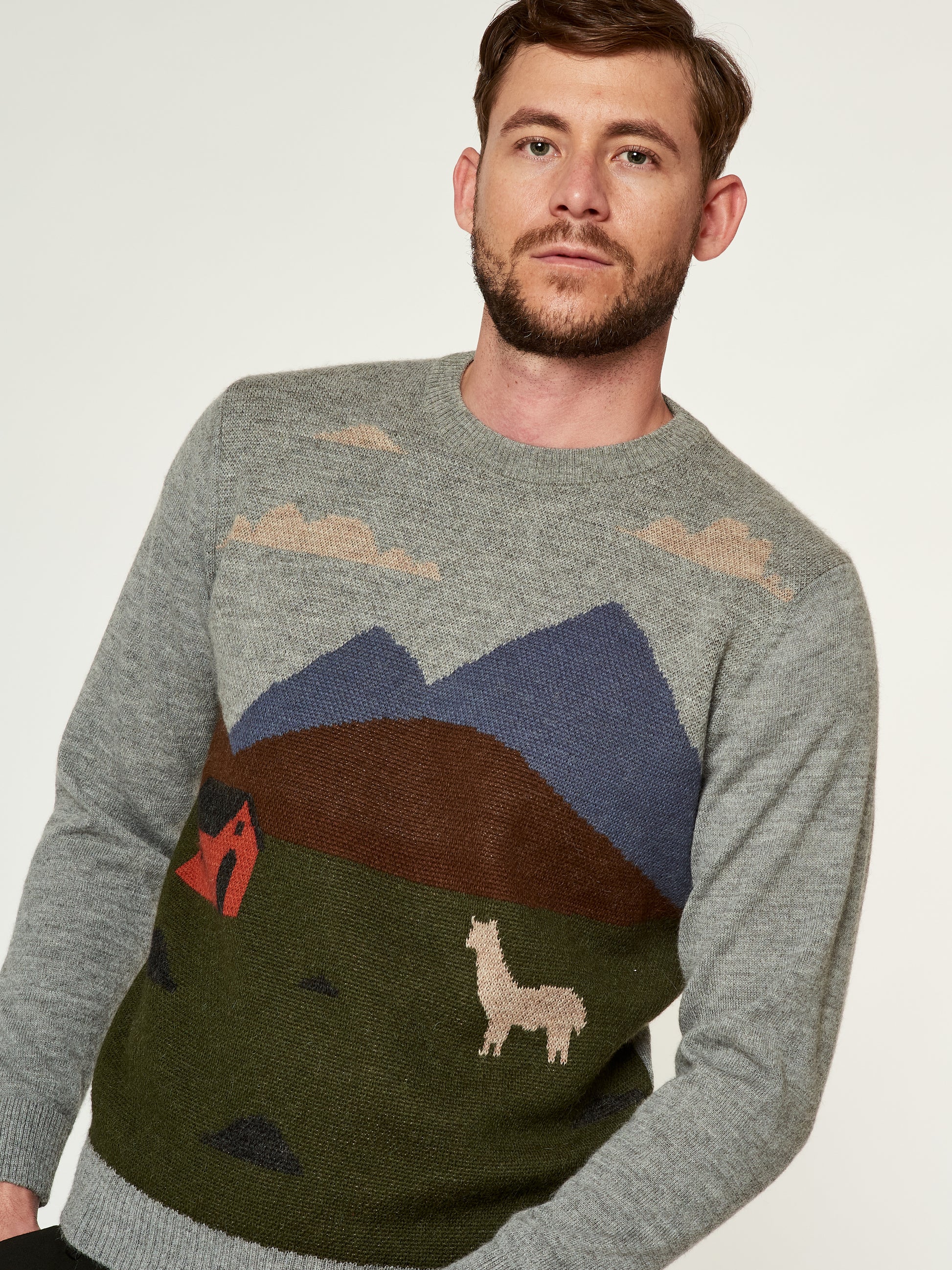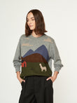 Suéter Langui en tonalidad gris, confeccionado en baby alpaca. Esta prenda unisex destaca por su diseño artístico tejido, inspirado en la cabaña del pastor ubicada en los Andes de Perú. La escena captura la esencia del paisaje andino con detalles de montañas, nubes y una alpaca en un entorno natural. Presenta acabados acanalados en el cuello, puños y basta. | Material predominante: Baby Alpaca