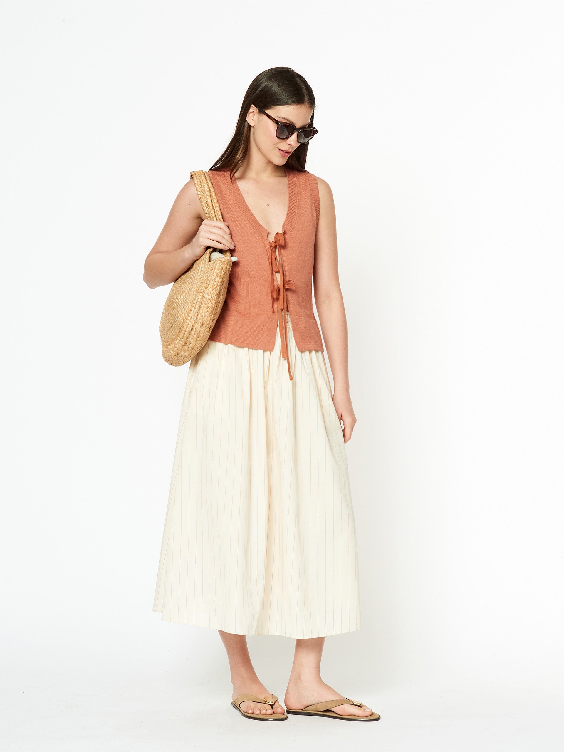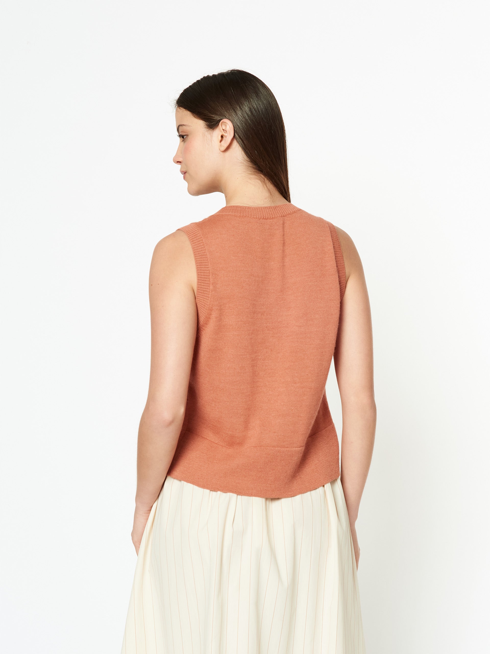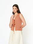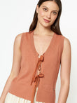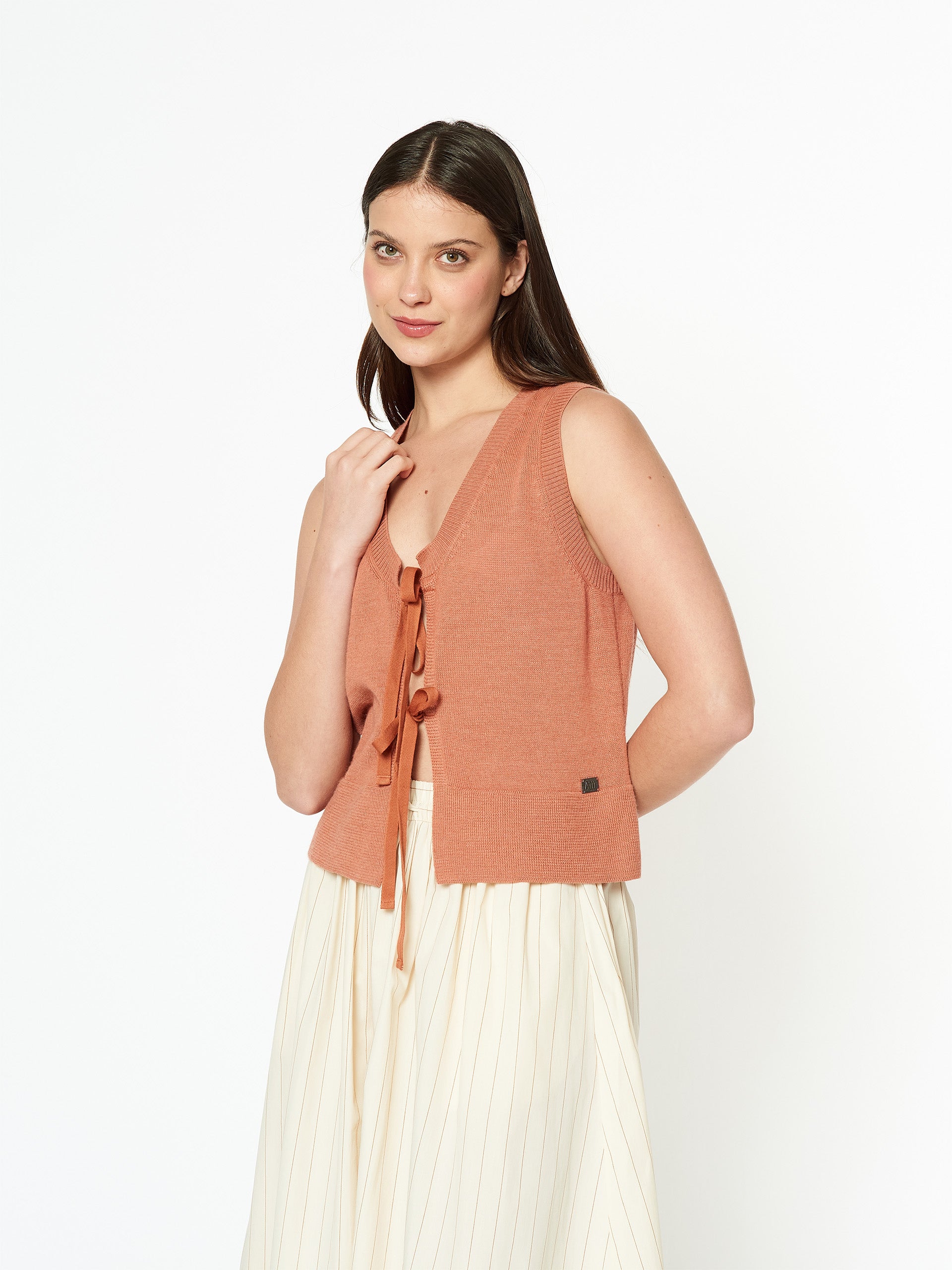 Chaleco Spathi en tonalidad naranja, confeccionado en 100% baby alpaca, fibra que ofrece suavidad y calidez natural. Presenta un diseño tejido con cintas de algodón que se anudan para cerrar la prenda, aportando un toque artesanal y delicado. | Material predominante: Baby Alpaca