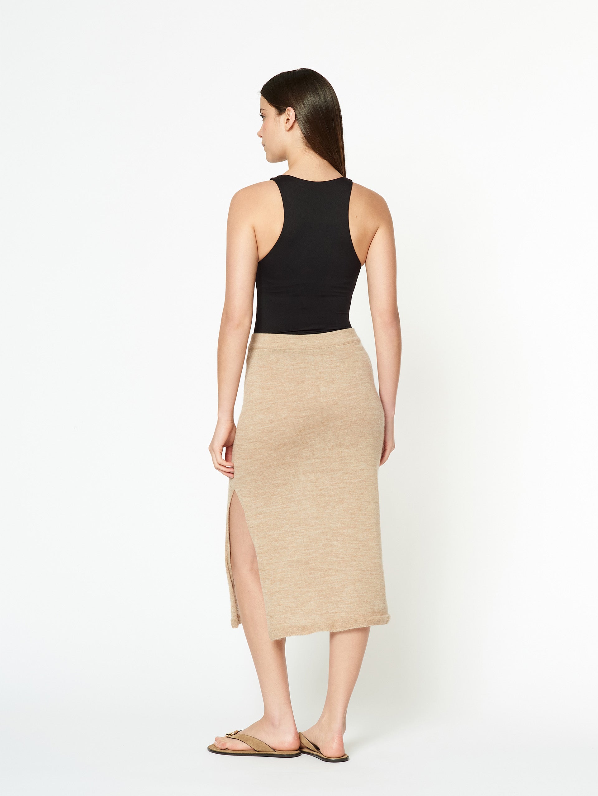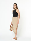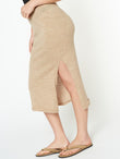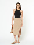 Falda Dinara en tonalidad beige, confeccionada en una mezcla de baby alpaca y elastano. De tejido jersey, es ligera y cómoda, con una abertura lateral que aporta movimiento y un estilo moderno. | Material predominante: Baby Alpaca